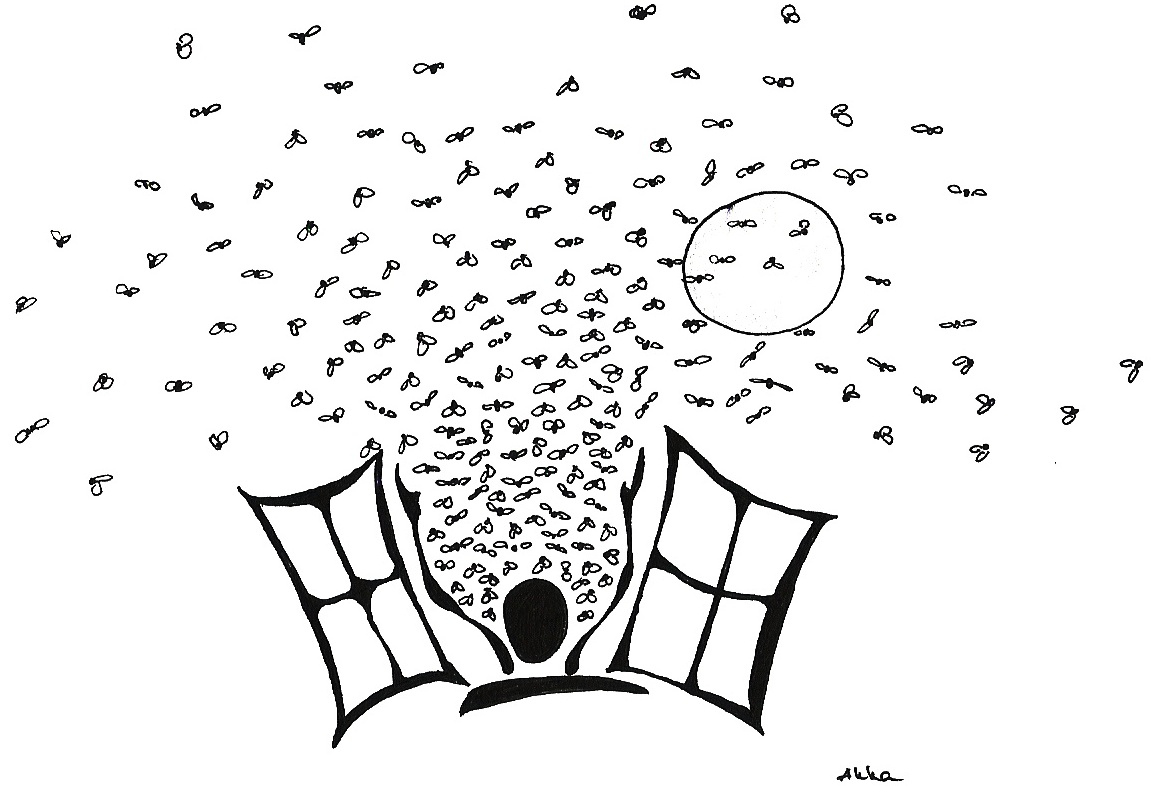 Aradi Réka Légy! című írása többféle gondolatra sarkallt. A szöveg elsősorban vizuális reflexiót váltott ki belőlem, mégpedig egy erős Jean Effel-i asszociációt. Jean Effel illusztrálta az Ádám és Éva regénye című mesekönyvet, valamint más, humoros formába öntött bibliai témájú történetet is, ahol Isten nagyszakállú tógás öregemberként jelenik meg, és kedélyesen cseverészik Ádámmal és Évával (és az állatokkal). Ezek a – jelen szövegben néhol túlságosan kimódolt és olykor vontatott – csevegős párbeszédek teszik mégis üdévé Aradi Réka meséjét, mely kvázi gyermekeknek szóló bibliai történetnek hat, de mindezzel együtt keveredik benne az eredetmítoszi történetszövés, és a humor, és ez a keveredés termékeny. Karazsia Lilla képén pedig jól megfigyelhető a teremtő mozdulat, ahogy a történethez híven Isten keze nyomán a legyek elkezdik ellepni a világot.