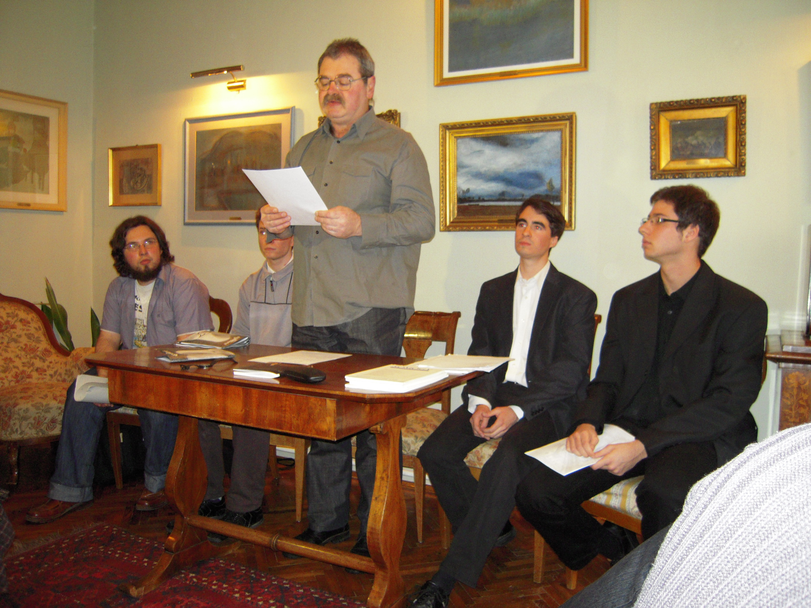 Balról jobbra a felolvasás szereplői: Nyerges Gábor Ádám, Török Sándor Mátyás, Káplán Géza, a műsorvezető, Tarcsay Zoltán és Vass Norbert