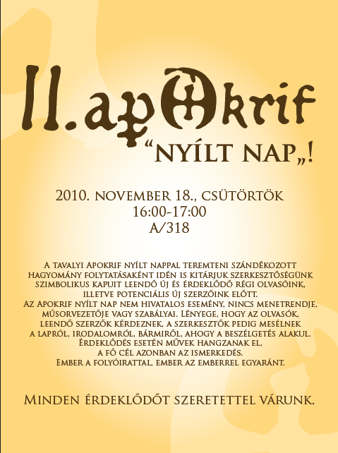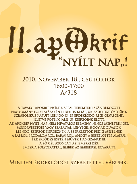 II. Apokrif “Nyílt nap” az ELTE BTK-n apokrifonline2010. november 17.2010. november 17.Ajánló, Közönségtalálkozók, Programok Bejegyzés navigáció ElőzőKövetkező Megosztás: Facebookon való megosztáshoz kattintás ide.(Új ablakban nyílik meg) Facebook Click to share on X(Új ablakban nyílik meg) X Tetszik Betöltés... Kapcsolódó bejegyzések