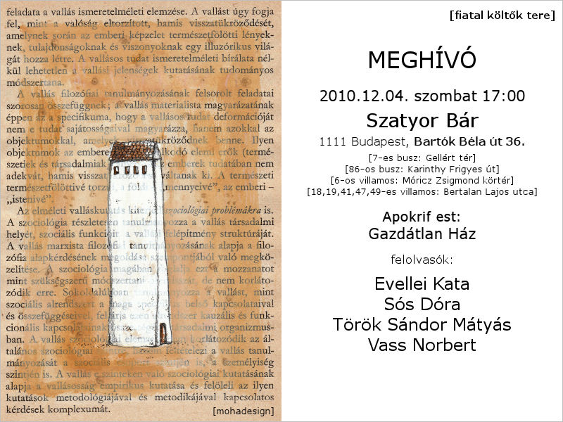 Gazdátlan ház – Apokrif est a Szatyor Bárban (programajánló) apokrifonline2010. december 2.2021. július 19.Ajánló, Közönségtalálkozók, Programok Bejegyzés navigáció ElőzőKövetkező Megosztás: Facebookon való megosztáshoz kattintás ide.(Új ablakban nyílik meg) Facebook Click to share on X(Új ablakban nyílik meg) X Tetszik Betöltés... Kapcsolódó bejegyzések