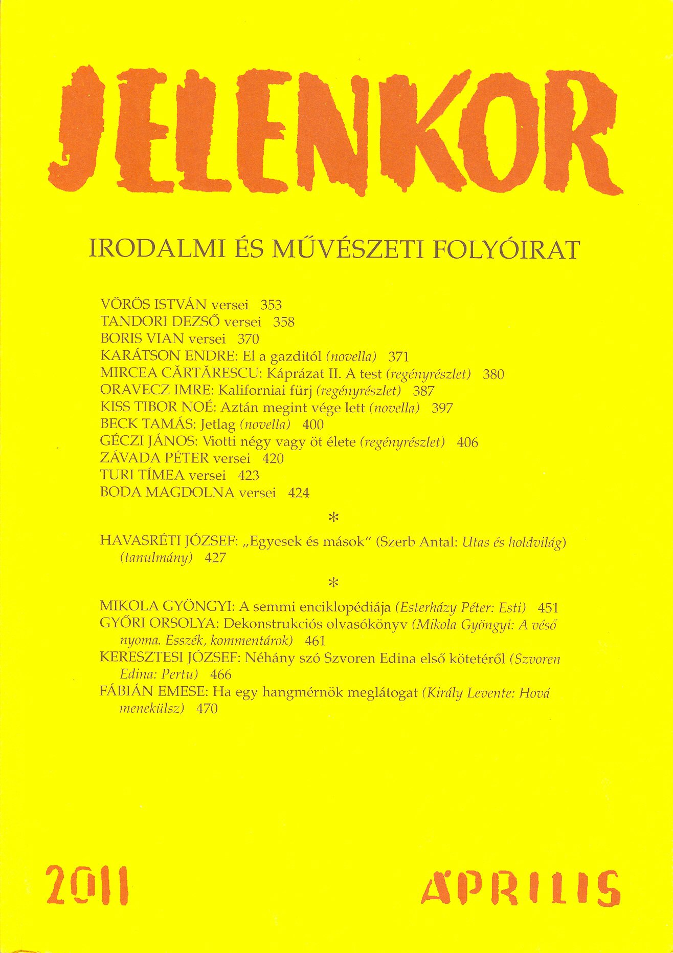 versét olvashatjuk a Liget friss számában: Himnusz a 21-hez. Két másik (Negyedéves jelentés, Bújdosó) Nyerges- és két Áfra-vers (aki lett volna, és aki lett) a friss Alföldben, illetve Smid Róbert recenziója a Helyi érzéstelenítésről: A grammatika érzéketlensége. Vass Norbert tudósít a Literán Farkas Péter Johanna című regényének bemutatójáról: Csendes ünnep. A FÉL Online-on Tinkó Máté Theodor Daybreak nem bír aludni című verse olvasható. Molnár Fábián Falvai Mátyás Gépindák című kötetéről az Újnautiluson: Falvaindák. Nyerges-műfordítások: egyrészt a Jelenkor friss számában (Boris Vian Jó napot kutya és Szegény Bodri című versei), másrészt a Napútban, Alan Morrison két versével: A gyűrű, Bocsáss-meg-ne. Meditatív novelláskötet: Vass Norbert interjúja Lázár Tiborral alias Occammal első szólólemeze kapcsán, a Kulteren. Nyerges-novellák a friss Spanyolnáthában: Sziránó és a nyafongó préri, Sziránó és az apró életkori odalevés. Kántás Balázs versei olvashatók az Ezredvég áprilisi számában (és néhány további kíséretében a Kulter.hu-n is), ugyanitt Marik Álmos recenziója legutóbbi kötetéről: Összefutó mítoszok. A Szépirodalmi Figyelő 2011/1-es számában Vass Norbert és Kántás Balázs több írásával is szerepel. Berényi Csaba Akaraterő és Dombovári Csongor Ikarosz tétele 2. (Az elrugaszkodás) című verse a FÉL Online-on olvasható. Mezőszemerei anzix: Vass Norbert ír a Prae.hu-n Bukta Imre Nagymama unokája c. kiállításáról. Vass Norbert recenziója Per Olov Enquist Egy másik élet című regényéről a Literán: Sötétségből ki a fényre. Árnyékköltők és fényzenészek: Vass Norbert ír az Instant elektrográfiai kiállításról a Prae.hu-n. Nem megúszni a versírást címmel olvasható Nyerges Gábor Ádám recenziója Vida Gergely Horror klasszikusok című kötetéről az április 30-i Népszabadságban.
