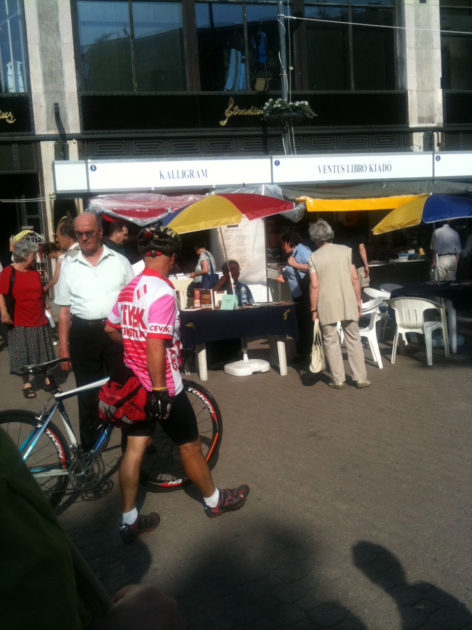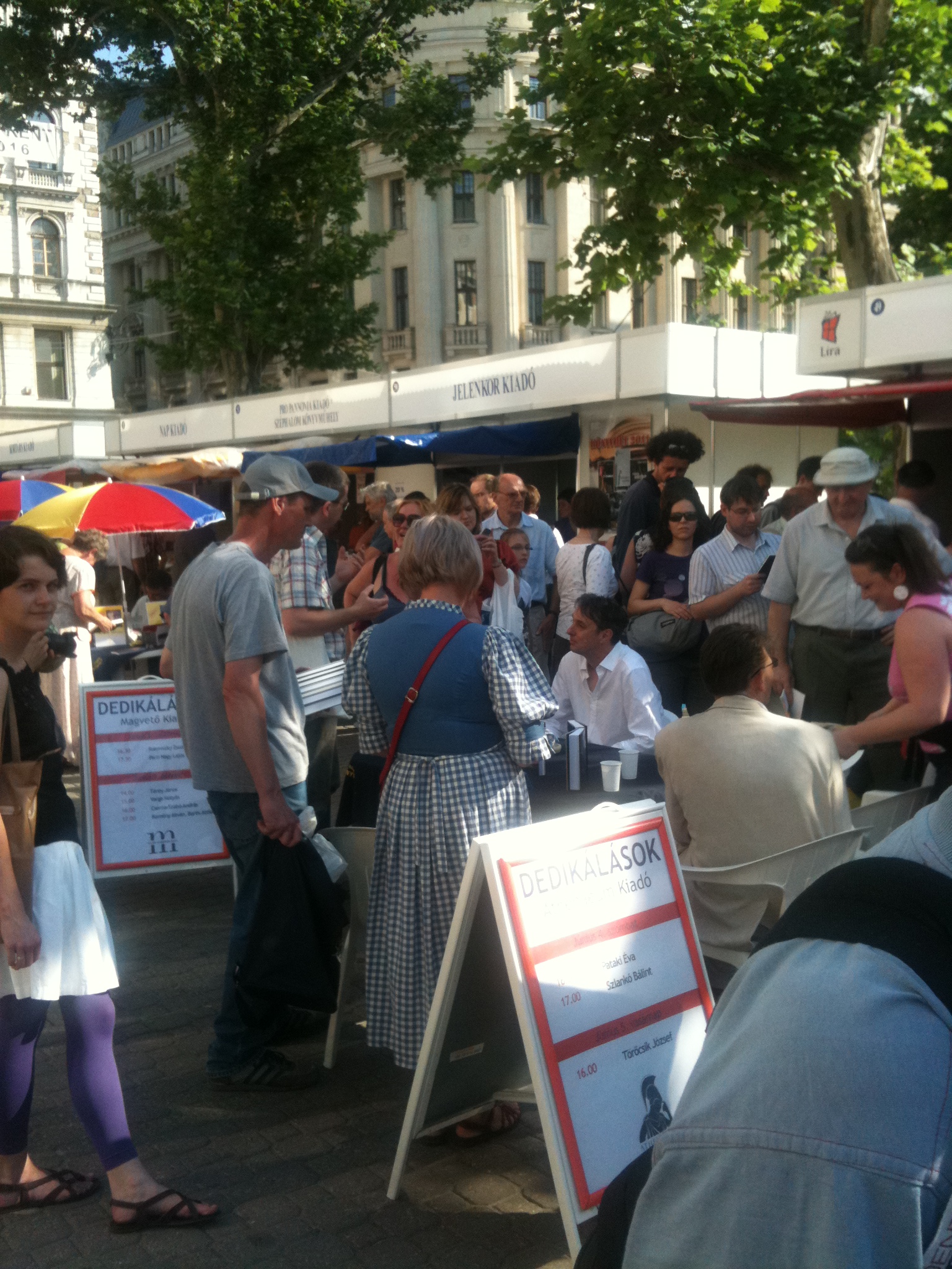 Ma bezzeg verőfényes tikkadatban érkezem a Vörösmarty térre, esernyő legföljebb napszúrás ellen kell. A tisztességgel végigkoplalt böjt után jókedvűen kezdem meg sátoros ünnepi körmenetem kiadótól kiadóig. A Magvető elé kettőkor Térey János telepedik Király Leventével, meg is kapom ezzel az isteni jóváhagyást: szabad a vásár. Gyorsan dedikáltatom a biztonság kedvéért otthon a táskámba dobott Protokollt. Elvégre rég olvastam regényt (mi több versest!) ilyen komótos élvezettel, lassan ízlelgetve a szavait, hát megérdemli a könyvespolcom a szerzői szignót. Áldottam is érte „Isten görbe vonalakkal írt egyeneseit”, de hogy sorba állni nem kellett, igencsak furcsállottam. A standoknál bőven jutott árnyék mindenütt, egy-két koradélutáni dedikáló reménykedve fürkészte a tömeget, s jobbhíján a szerkesztőjével beszélgetett. Kihasználva a ritkás embersűrűt, igyekeztem beszerezni a tegnap már fejben összeállított könyvlistám darabjait. Aktuális kedvencem, Térey kötete mellé szépen sorjában érkeztek a többiek: Parti Nagy Lajos zöld Az étkezés ártalmasságárólja, Spiró legújabb novelláskötete, a Kémjelentés sárgás barnája. Biztonsági vételek, tudom jól, éppen ezért nem is mondok le róluk. Birtoklási vágynak engedek a Jelenkornál is, végképp kiderül, valóban esendő állat vagyok: akárhogy is legyen, képtelen lennék ellenállni a lehetőségnek, hogy négykor vissza ne jöjjek Márton László kackiás cirkalmaival teleszántott Te egy állat vagy! példányért. A tintapacás ajánlás már maga megér egy misét, hiába olvashatatlan. Közben azon morfondírozom – Teúristen se számolja meg hányadik köröm alatt –, mi a fészkesnek zarándoklok itt össze-vissza, főbólintok, térdepelek a szerzői magasságok előtt, s nem vágom hónom alá e napi kincsvadászatom eredményét, hogy mielőbb a hűs szoba, hűs foteljében igazán találkozhassam velük.