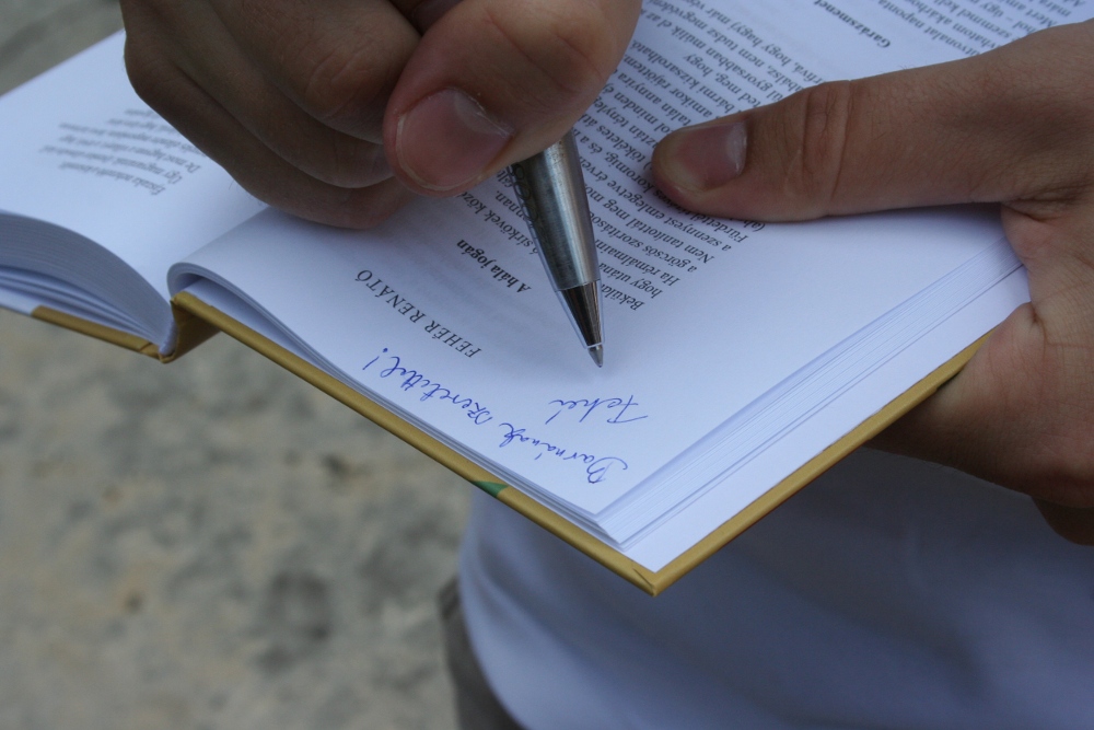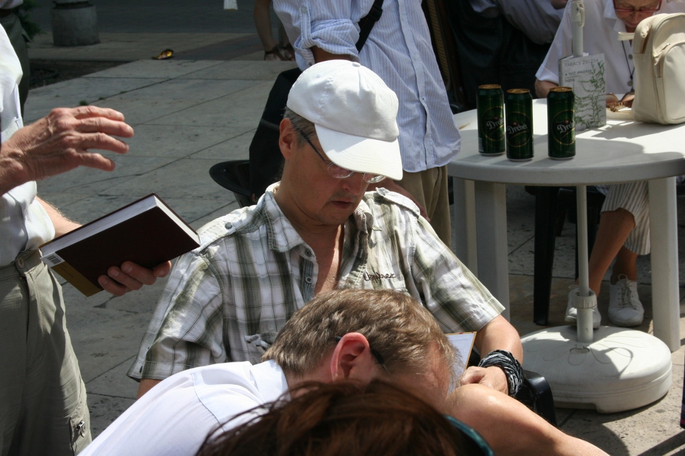 Még annyit a végére, hogy nemcsak a Vörösmarty téren van könyvhét Pesten. Az Írók Boltja előtt dedikált háromtól a teljes Szép versek antológia-szerzőbrigád. Fasza kis dzsembori volt, sok fiatal irodalmár, többek között lapunk szerzője, Fehér Renátó is dedikált, miközben Bajtai betűember András, mindenki legnagyobb bánatára végleg kiborította a sörét. Ja igen, egy BKV éves bérletet találtak az Európa kiadó standjánál. A tulajdonos ott veheti vissza, ha azóta nem tette.