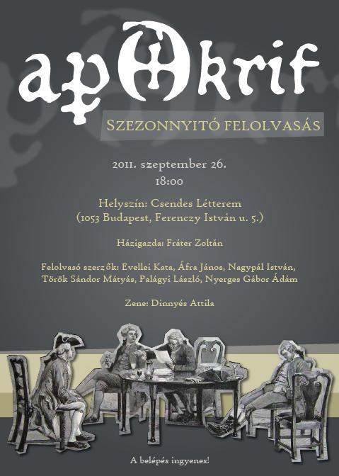 Apokrif-szezonnyitó a Csendesben (programajánló) apokrifonline2011. szeptember 19.2021. július 19.Ajánló, Közönségtalálkozók, Programok Bejegyzés navigáció ElőzőKövetkező A plakátot Radnóty Zoltán készítette. A program facebook-eseménye ide kattintva érhető el. Megosztás: Facebookon való megosztáshoz kattintás ide.(Új ablakban nyílik meg) Facebook Click to share on X(Új ablakban nyílik meg) X Tetszik Betöltés... Kapcsolódó bejegyzések