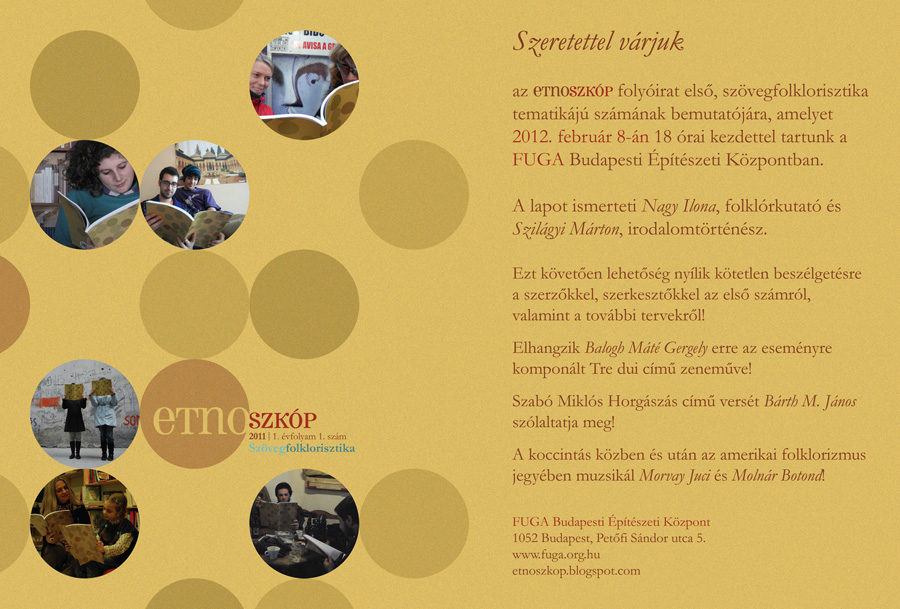 Ugyancsak szeretettel ajánljuk Kedves Olvasóink figyelmébe az Etnoszkóp első számának bemutatóját, mely február 8-án 18 órakor kezdődik a FUGA Budapesti Építészeti Központban.