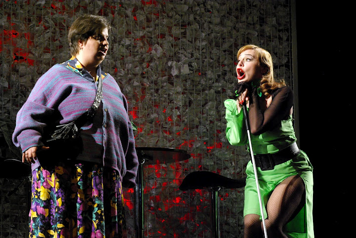 A díszletet adó papírszemét halmok ellenpontja a koszos edényektől roskadozó hűtőgép és a romlott ételek, melyek receptjeit élvezettel cserélgeti Bożena és Halina. Az előadás különlegessége számomra Ilyés kopottvörös körömlakkja mellett az igazi dohszag volt, ami a nagymama takarójából áradt. A számtalan magyarországi hipermarket feliratos táskája és reklámfüzete mellett a Bárka Színház régi dokumentumai adják a falként és szeméttárolóként üzemelő papírhalmokat. A hazugság, a látszat szimbóluma a Programvezetőnő és segítői elektromos cigarettája, amelyet némi „dohányzás” után könnyedén retiküljeübe dobnak, illetve a gyanúsan piros vörös bor, amelyet üvegszámra képesek inni a szereplők.
