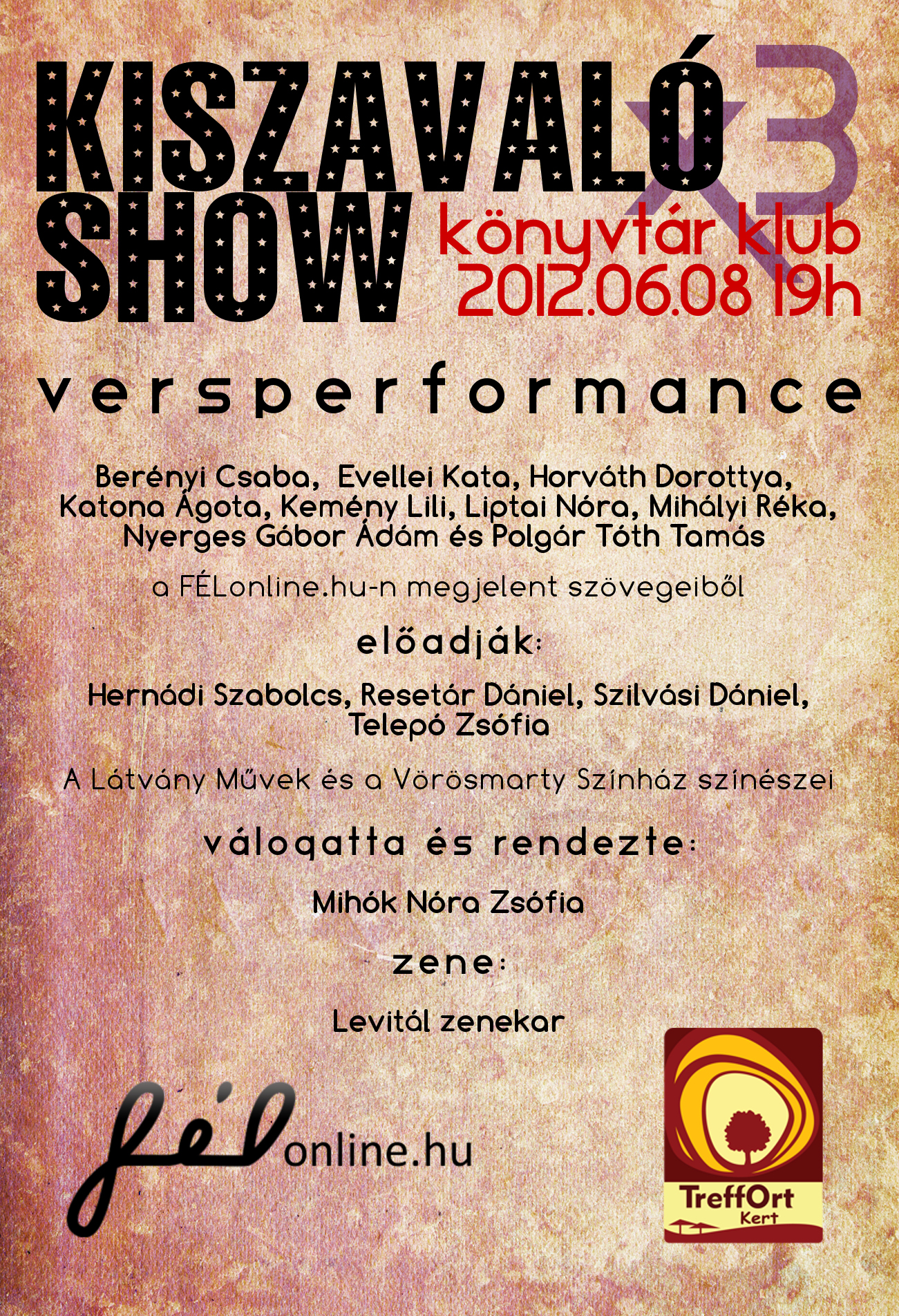 Kiszavalóshow a Könyvtár Klubban (programajánló) apokrifonline2012. június 2.2021. július 19.Ajánló, Programok Bejegyzés navigáció ElőzőKövetkező Ezúttal az Apokrif és a FÉL Online szerzői által írt művekből összeállított Kiszavalóshow című versperformansz közelgő előadását ajánljuk olvasóink figyelmébe: Megosztás: Facebookon való megosztáshoz kattintás ide.(Új ablakban nyílik meg) Facebook Click to share on X(Új ablakban nyílik meg) X Tetszik Betöltés... Kapcsolódó bejegyzések