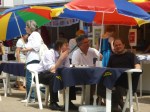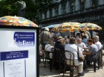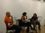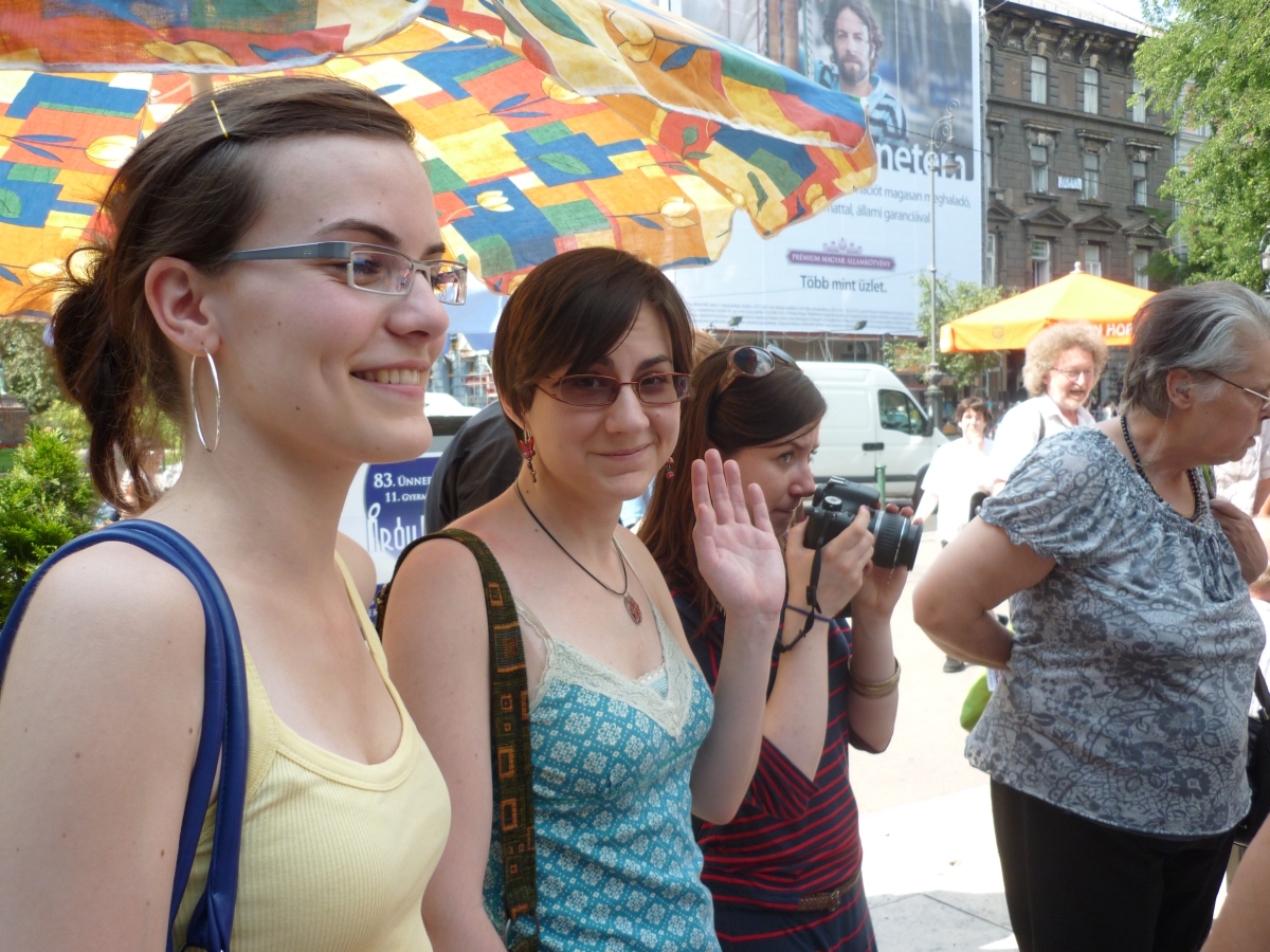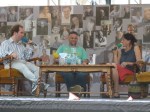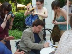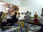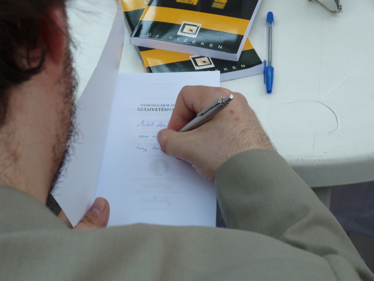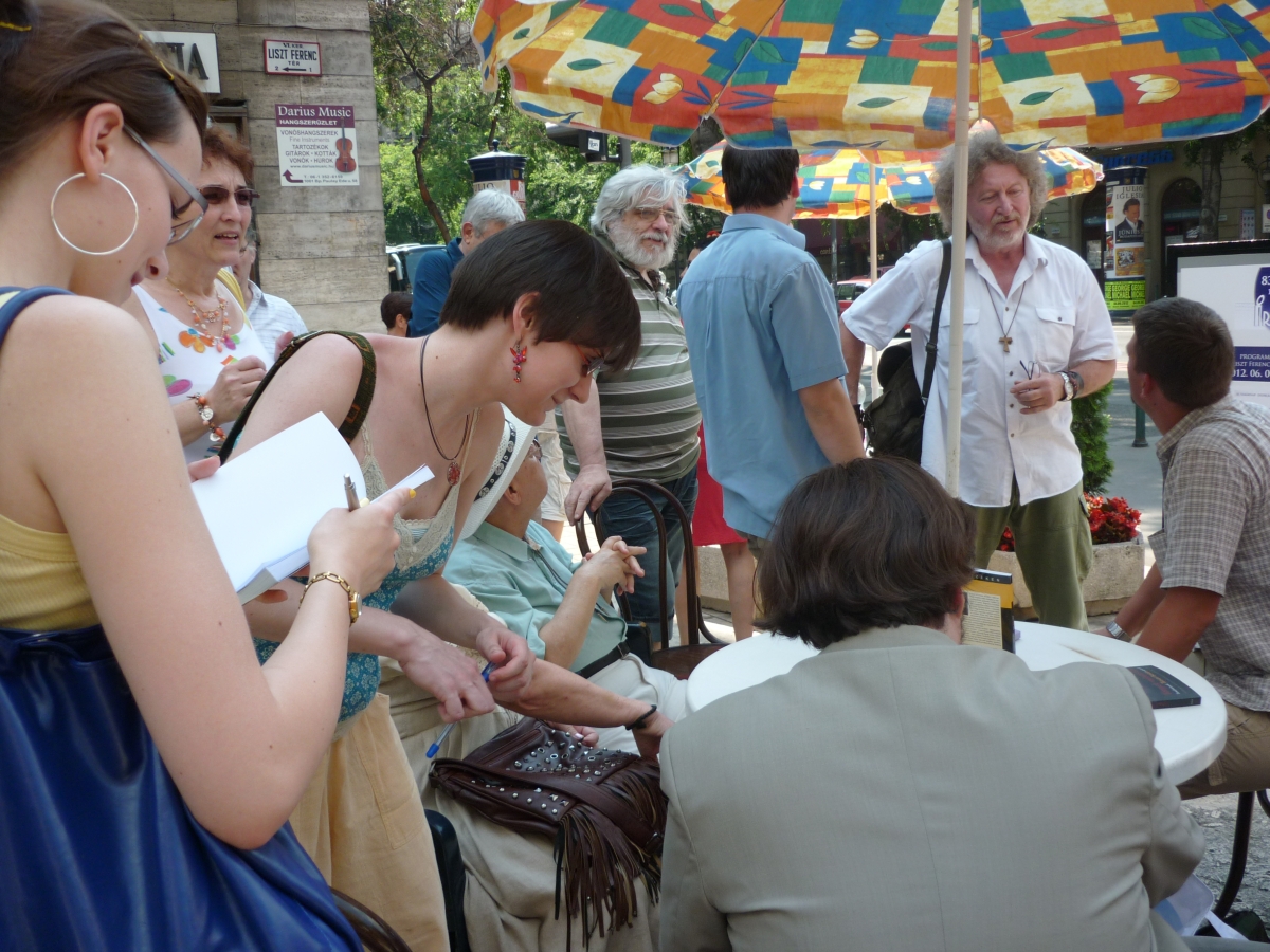 Háromnegyed háromkor elindultam a térről az Írók Boltjához. („Te ilyenkor az Írók Boltjába mész??” – „-hoz!”) Nyerges Gábor Ádám kissé agresszív, de nagyon hatásos kampányt folytatott dedikálása és kötete népszerűsítésére a facebookon, ami meg is hozta gyümölcsét, hiszen már egy kisebb rajongótábor várta, amikor odaértem. Nem tudom, hogy Evellei Kata készített-e rajzocskát a jegyzeteihez, de én lerajzoltam az impozáns asztaltársaságot: jobbra tőle Borbély Szilárd és Kabdebó Lóránt, balra Turczi István kérdezgeti a rajongókat, hogy „Nagyon szép lett, ugye? Nagyon szép lett.”. És ami a legszebb a Számvetésforgóban, hogy rengeteg vers van benne. Aztán volt egy visszafogottabb hangulatú dedikálás is már újra a Vörösmarty téren: Zsolté, illetve Zsoltoké. (Lengyel) Zsolt szerint addig jó volt, amíg Bagi Zsolt kislányával színeztek. De mégis ki gondolta, hogy kritikaköteteket dedikáltatni fognak?! (Egy főből álló rajongótáborát dokumentáltam, megtalálható a képek között.) Rajongók helyett fagyit kapott Zsolt.