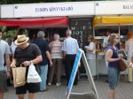 Ekkor már egészen biztosan napszúrást kaptam, ugyanis megfordult a fejemben, hogy megveszem az Úton, az eredeti tekercs kiadását, mert annyira szépen van tördelve. Az Európa Kiadó standjánál veszélyesen szép könyvek vannak egyébként is. Az új Ulysses és Jonathan Franzen Szabadság című könyve is nagyon dögös lett. Aztán írtam egy listát, hogy mit kérek a szülinapomra – az Édes hazámat vagy Dunajcsiktól a Balbec Beach-et, amelynek novelláiban budapesti terek idézik meg a történeteket, amiről azt sejtem, hogy közelebb áll Proust világához, mint gondolnánk. (Egy felolvasott részleten, meg a szép külalakon kívül még csak a pódiumbeszélgetésből ismerem persze.)