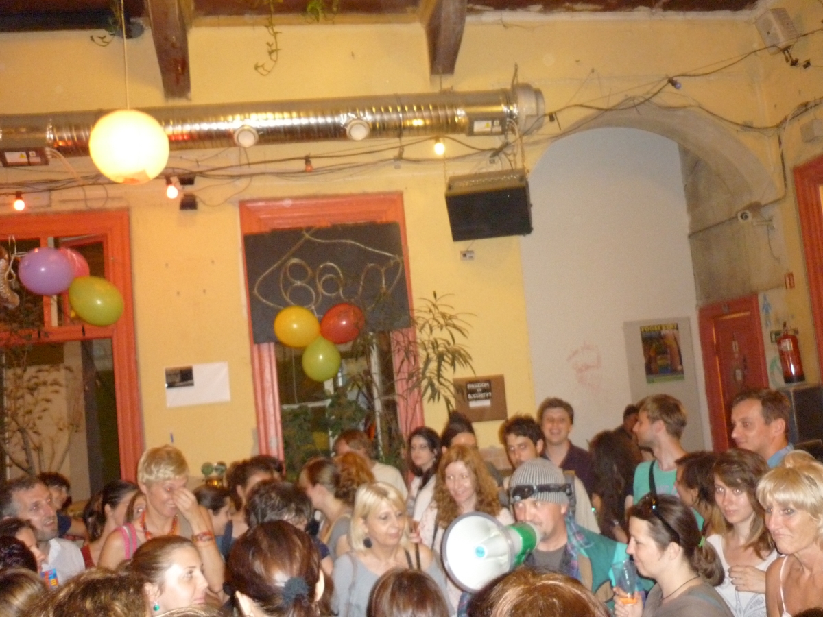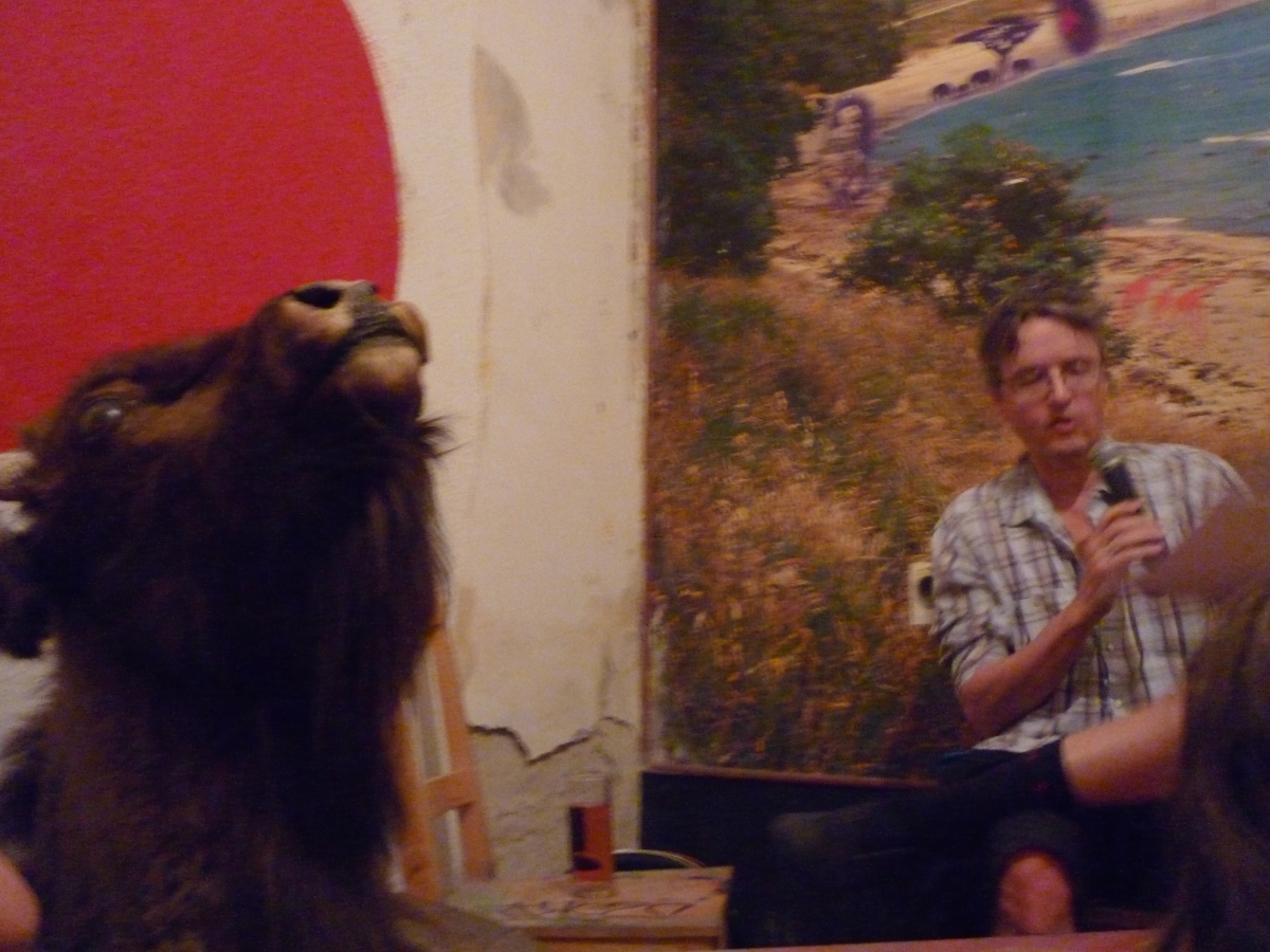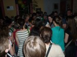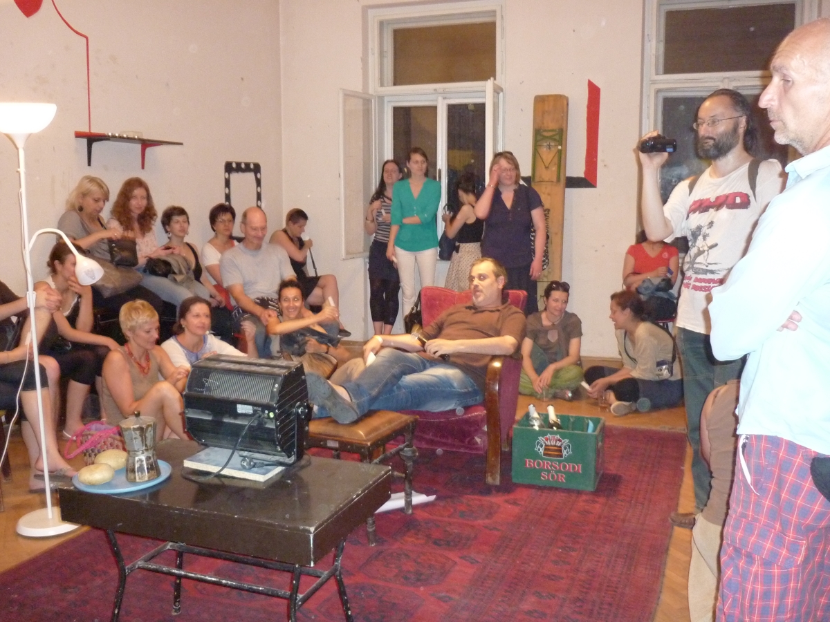 Még nincs vége, mert tízkor kezdődött a Fogasházban a Margó fesztivál keretében a nap legfurább programja. Mire átverekedtük magunkat a Király utcai lomtalanításon és megérkeztünk az Akácfa utcába, Pethő Anita (ő a Prae.hu-nak jegyzetelt) már kész haditervvel várt arra vonatkozóan, hogy miként fogunk bejutni annak ellenére, hogy rengetegen vannak, kártyájuk is van, nekünk meg nincsen. A házmester végigmutogatta a házban található kiváló, összkomfortos lakásmaradványokat az érdeklődő tömegnek. A lakásokat a luxus kategóriába az emelte, hogy mindenhol megtalálható volt egy novelláját felolvasó író. Ki is néztem magamnak egy lakást, amelyben Garaczi László lakott: nem is tudom, hogy a Hemingway-től való szarvasfej vagy Ginsberg papírzsepije tetszett-e jobban, de havi tizennyolcezret megér.