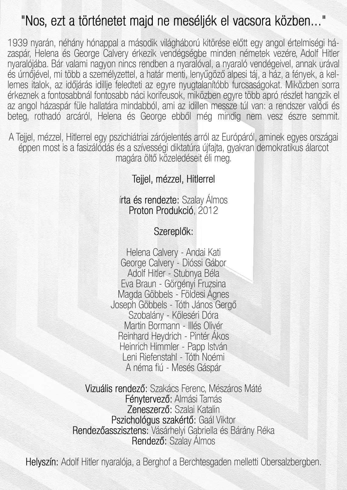 Egészen különleges fontosságú programot ajánlunk ezúttal olvasóinknak: büszkén adunk hírt a Proton Produkció soron következő premierjéről, szerzőnk, Szalay Álmos legújabb darabja, a Tejjel, mézzel, Hitlerrel ősbemutatójáról.