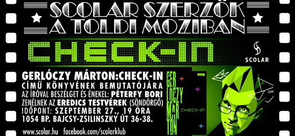 A Scolar Könyvkiadó őszi programsorozatának keretében került megrendezésre Gerlóczy Márton Check-in című kötetének bemutatója 2012. szeptember 27-én a budapesti Toldi moziban. A szerzővel Péterfy Bori beszélgetett, a zenei átkötésekről a söndörgős Eredics testvérek gondoskodtak.
