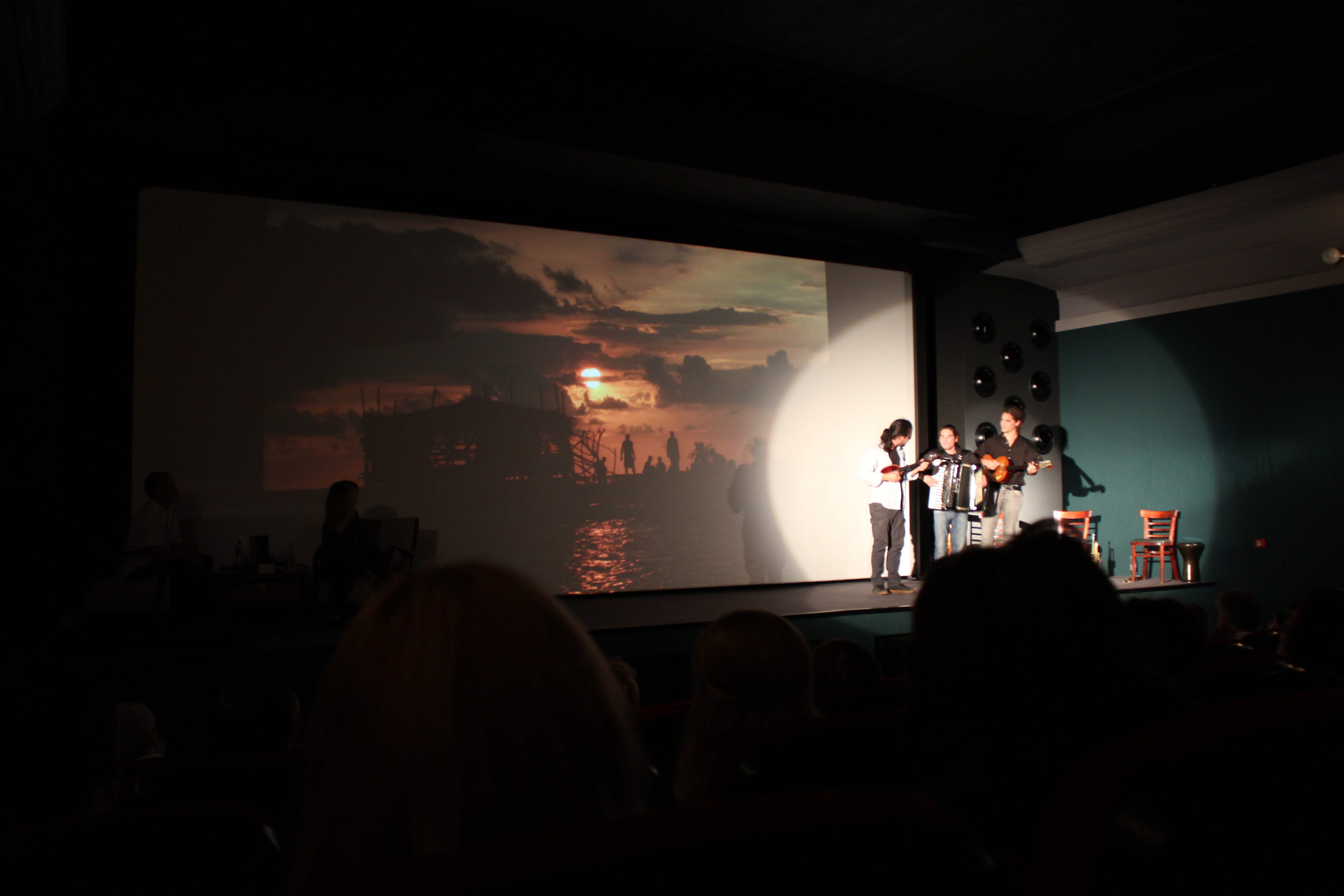 A közönség részéről kitüntetett figyelem kísérte a rendezvényt, a késve érkezőknek még éppen jutott hely a Toldi mozi nagytermének lépcsőin, s a létszám a következő másfél órában sem csappant meg. Sugár S. András, a Scolar Kiadó marketingfelelősének felvezető sorai után Gerlóczy Márton is köszöntötte a jelenlévőket, elsősorban az Eredics testvéreket a Söndörgő zenekarból, mert „ők legalább színvonalat visznek ebbe az estébe”. Hűen a kötet útinapló jellegéhez, minden egyes, az est folyamán szóba kerülő helyszínt a háromfős zenekar vezette be instrumentális darabjaival.