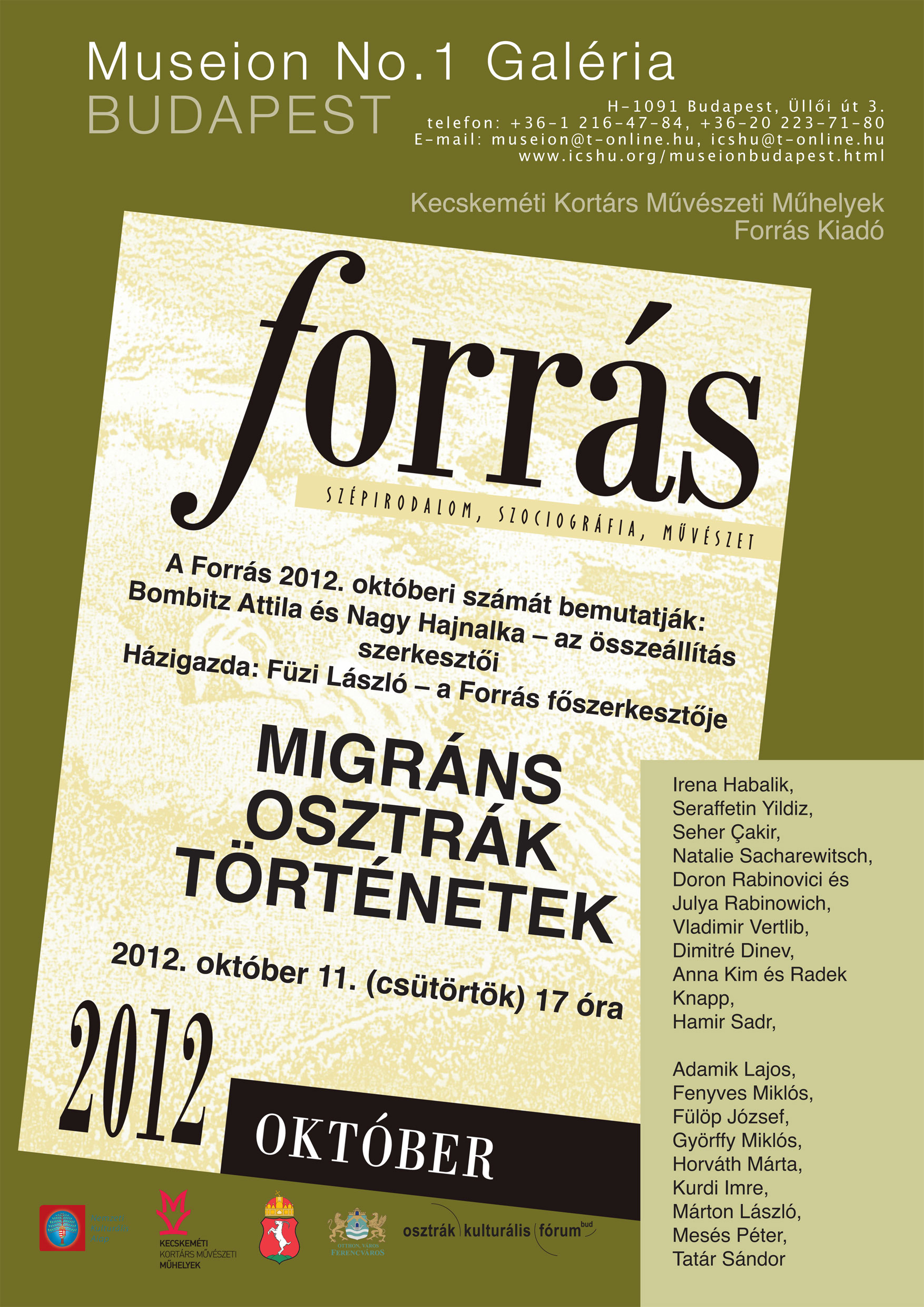 Másként látni – ezek voltak a Forrás októberi lapszámbemutatójának hívószavai. A kecskeméti folyóirat Migráns osztrák történetek címmel Ausztriában élő, de nem osztrák származású, sikeres szerzők műveit adja közre. A speciális témából fakadó szerkesztési nehézségekről és a közölt szövegek sokrétűségéről, problematikus voltáról Füzi László főszerkesztő beszélgetett a szerkesztőkkel, Nagy Hajnalkával és Bombitz Attilával. A folyóirat a közelmúltban lett az Üllői úti Museion No. 1 galéria társtulajdonosa. Október 10-én a Forrás először mutatkozott be itt, budapesti otthonában.