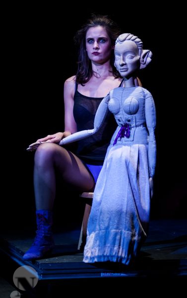 Ezt a dinamizmust, életteliséget az őket – és minket – körülvevő tárgyi környezet ellensúlyozza. A rendkívül kopár, jóformán csak csupasz fémszerkezetekből, szabadon lógó drótokból és műanyag ponyvákból álló díszlet elemi erővel jeleníti meg a darab sivár, sötét világát. A mindent betöltő feketeséget az itt-ott, egy-egy sarkot bevilágító színes fények törik meg, amelyek azonban sohasem tartanak sokáig – a sötétséget ugyanis a darab tanúsága szerint lehetetlen elűzni. Ennek egyetlen alakba sűrített jelképe az éjt alakító Nagy Mari, aki az előadás folyamán végig ott ül a nézők szeme előtt: figyel és vár, mozdulatlanul, mint kezdet és vég. Ez a kiiktathatatlan jelenlét összefogja az előadást, és az állandóság érzetét kelti, de nyugtalanító is: sohasem lehet tudni, az éj mikor szólal meg vagy tesz egy váratlan mozdulatot, hogy, saját természetét megcáfolva, beleavatkozzon a szereplők sorsába. Az általa viselt fehér hálóing sajnos némileg megtöri a szigorú, rideg összhatást – a figura így kissé talán túlságosan nagymamás jelleget ölt, amire a színésznő kifejezetten emberi, érzelmes játéka is ráerősít, ellentmondásos végeredményt hozva létre. Nagy Mari éje nem kérlelhetetlen, ősi erő, hanem, amint azt Martinovics Dorina Tündéjével való közös jelenete mutatja, az emberi lelket ismerő és vele együtt érző transzcendens lény. Szokatlan, de érdekes értelmezés ez, ha nem is lehet vele teljesen egyetérteni, és meglehetősen el is üt az előadás egészének koncepciójától: a minket körülvevő világ részvéttelenségétől.
