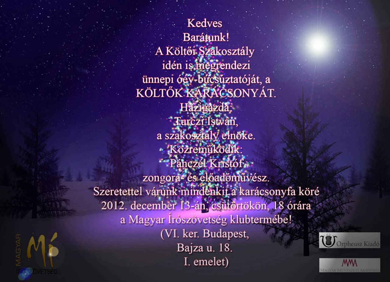 Költők karácsonya (programajánló) apokrifonline2012. december 8.2012. december 10.Ajánló, Programok Bejegyzés navigáció ElőzőKövetkező Megosztás: Megosztás Facebookon(Új ablakban nyílik meg) Facebook Share on X(Új ablakban nyílik meg) X Tetszik Betöltés... Kapcsolódó bejegyzések
