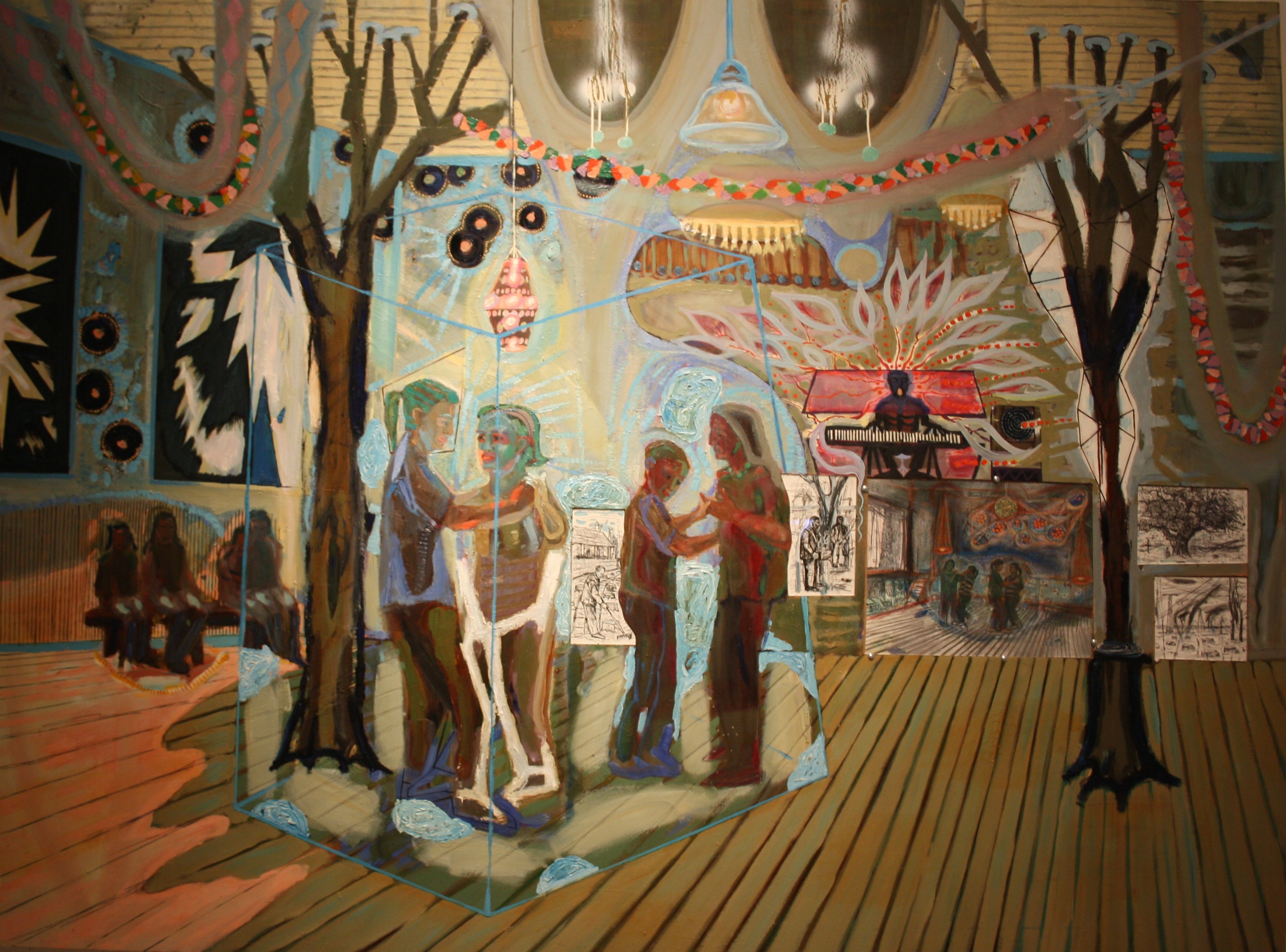 Az assemblage-szerű képépítkezés számtalan érdekes példájával találkozhatunk a kiállítótér főszárnyának végén, különösen a kilencvenes évek fémes, gyufaszálas, cserépdarabos, talált tárgyas munkáin. Ezektől jobbra kanyarodva a falusi lét karaktereinek arcképcsarnokán sétálhatunk át, hogy végül egy monumentális Magasfeszültségű villanypóznás videoinstallációhoz jussunk, ahonnan visszakanyarodhatunk a kiállítás középső tengelyéhez.