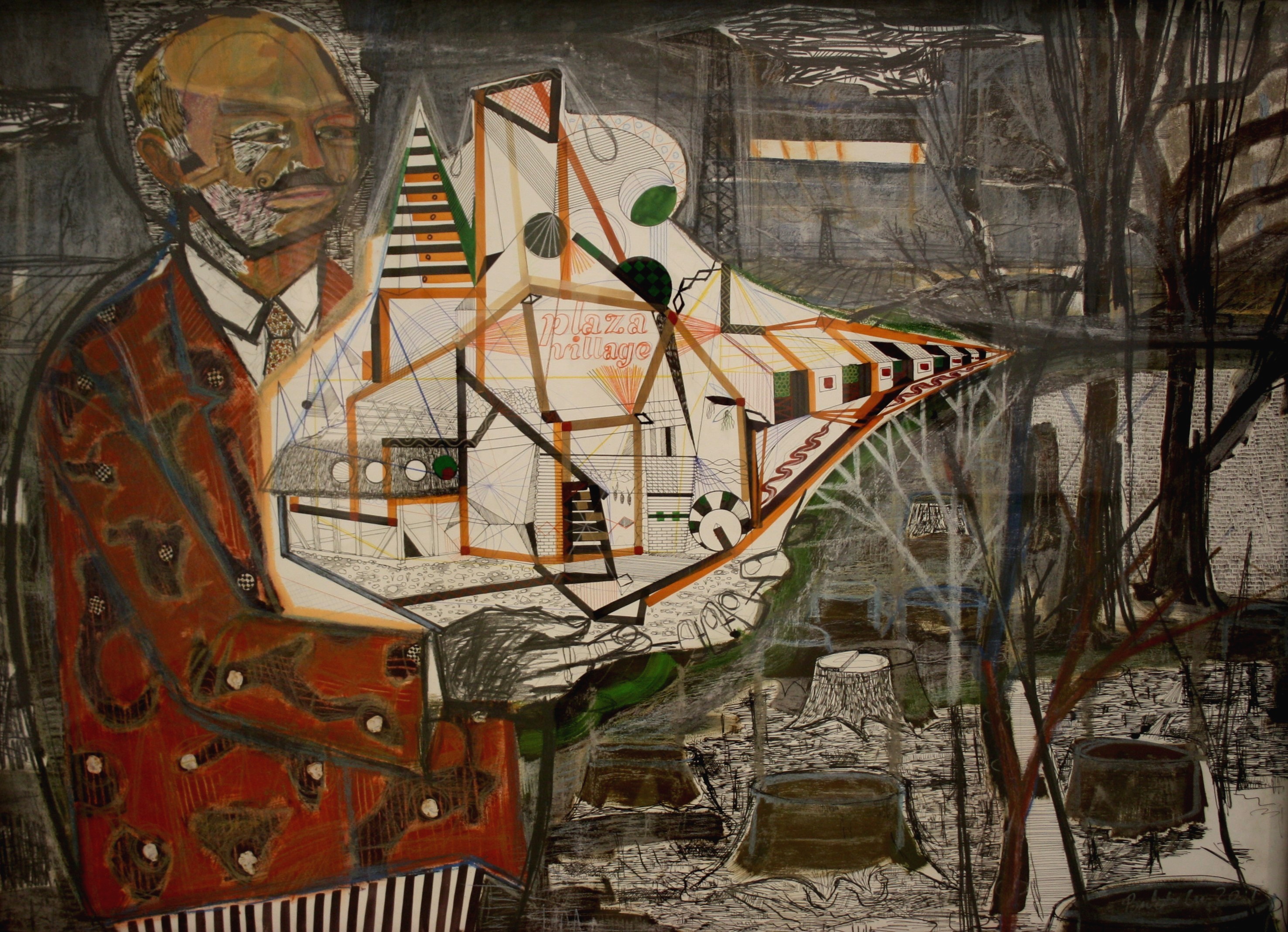 A munkák egy részét – az előbb említett mű mellett például az Okos táj installációt vagy a Baromfiudvar című képet – láthattuk már öt évvel ezelőtt a Modem Kibontott táj című retrospektív kiállításán is, a legtöbb munka azonban az utóbbi évek termése. Rögtön a kiállítás elején vadonatúj képek sorakoznak, amelyeken felismerhetjük a korábban már látott alakok és képépítkezési technikák sajátosságait, az arte poverára jellemző anyaghasználatot, a témát tekintve pedig a falusi lét jellegzetes elemeinek kommercializálódását. A Vidéki polgármester plázamakett-tel című képen a kezében épületmodellt tartó döntéshozó alakja első pillantásra mintegy demiurgoszi figuraként tűnik fel, a részletes megfigyelés után viszont a zakó mintázatából előtűnő állatalakok és a háttérben látható tarvágás miatt a férfi egyértelműen reprofanizálódik. Ráadásul a polgármester jobb kezén mintha a mutató- és középső ujj sejtelmesen kereszteznék egymást – visszaköszönni látszik tehát a régebbi képekről ismerős irónia, ám itt a helyzet már-már groteszkbe csap át, hiszen a tetteknek súlyos tétje van.