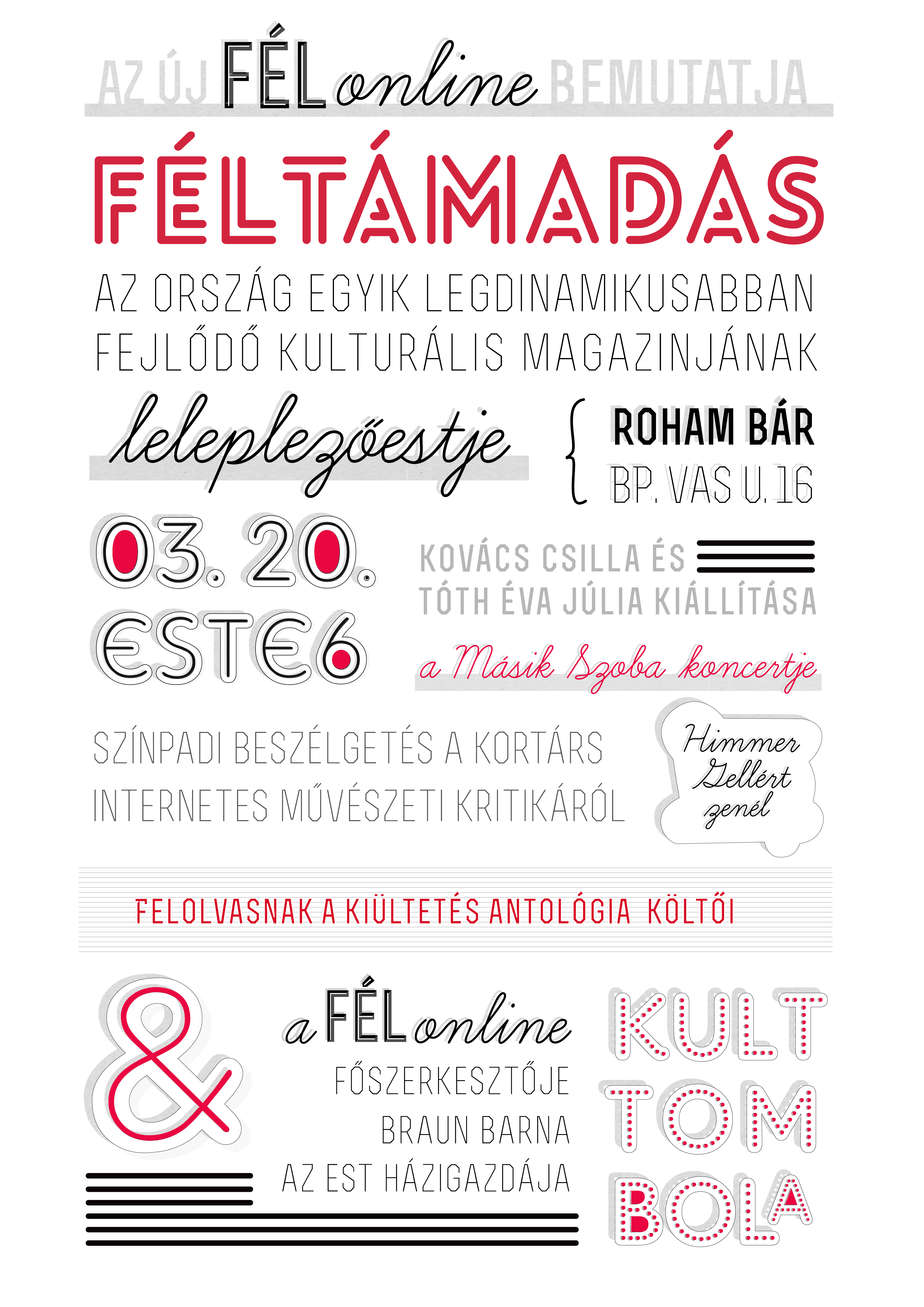 2013. március 20-án egy nagyszabású, összművészeti esttel ötvözött buli keretében újul meg az egyik legdinamikusabban fejlődő, fiatal bölcsészek által szerkesztett online kulturális magazin, a FÉLonline.hu. Az este hattól éjfélig tartó programon megnyílik egy kiállítás, felolvasnak a novemberben bemutatott Kiültetés c. versantológia szerzői, majd fiatal kritikusok pódiumbeszélgetését hallgathatjuk meg.