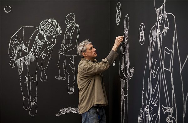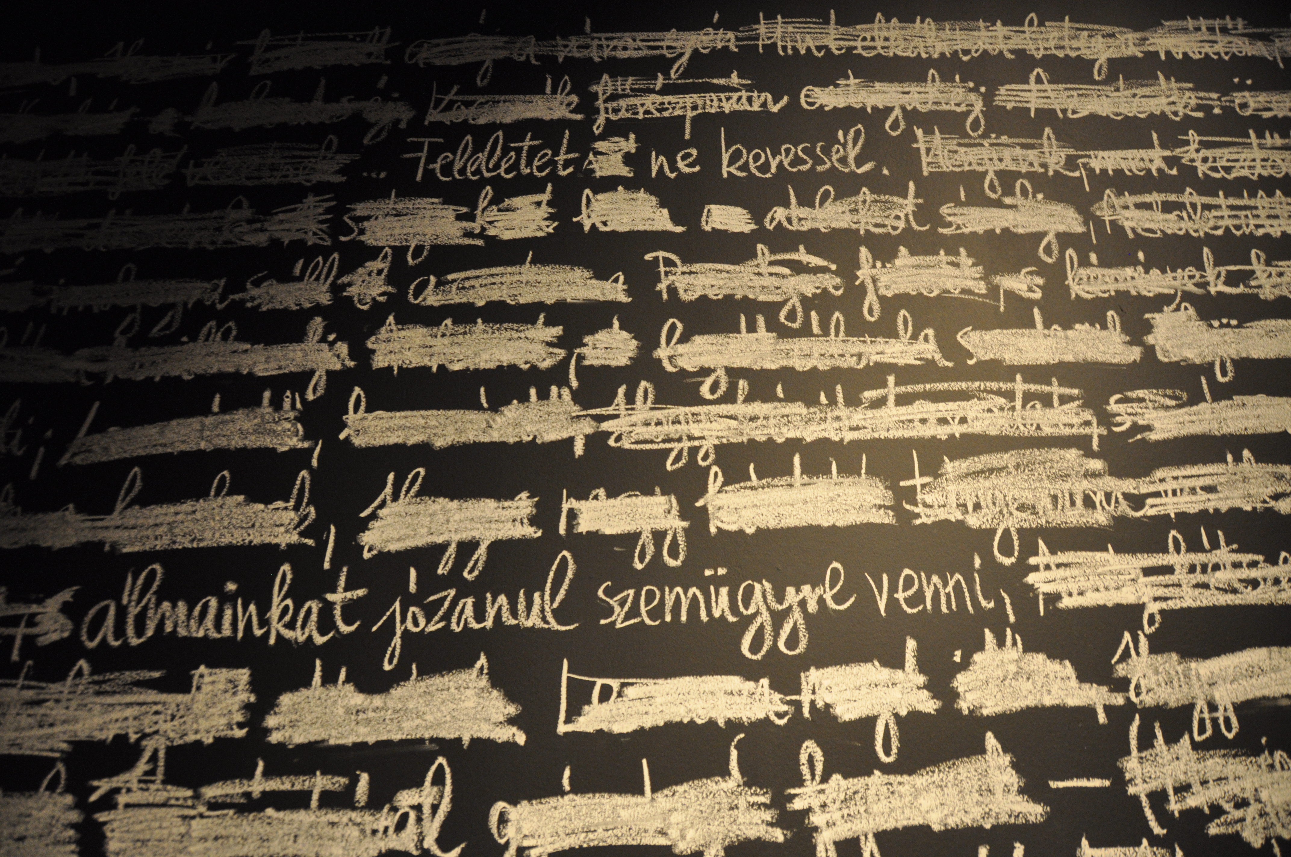 A falakon látható fehér krétarajzok momentumok: egy nyaralásról, egy építkezésről…; jól elkapott, skiccszerű mozdulatok – egy vázlatkönyvhöz hűen. A vonalas rajzok lazák, de pontosak, nem olyan masszívak és mesterkéltek, mint egy Soós Nóra-munka. A kiállítás egészét átívelik, de nem csak a videókat kötik össze az egységesen fekete falakra készített – többnyire figurális – fehér krétarajzok, amelyek összefüggéstelenül kapcsolódnak a kiállított művekhez, ezzel hangsúlyozva a kiállítás gyűjtő jellegét. Ezen felületek közül a legérdekesebbet teljes egészében beteríti T. S. Eliot verse, J. Alfred Prufrock szerelmes éneke. A hevesen áthúzott sorok közül csak ez a három rész maradt ép: „Feleletet rá ne keressél / ideje / álmainkat józanul szemügyre venni”. Ez számomra a kiállítás esszenciája. Bár egy dada vers talán találóbb volna.