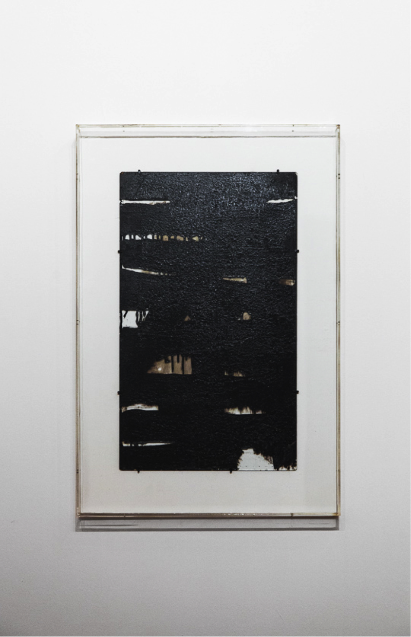 [5] A szűken vett korszak 1979-ben vette kezdetét, a festmény fény és tér felőli értelmezése a művész œuvre-jében azonban már az 1940-es években elkezdődött. Erre mutat példát az utolsó teremben látható üvegalapra kátránnyal készült korai munkája (2. kép: Goudron sur verre, 76,5 x 45,5 cm, 1948-3). A páli fordulatra 1979-ben került sor: „Egy alkalommal hosszú órák munkája után úgy éreztem, hogy mindaz, amit addig festettem rossz, csak tocsogok a feketében, és nem tudok rátalálni a helyes útra. Kimerülten abbahagytam a munkát. Másnap, amikor újra ránéztem a képre, egészen másképpen láttam, mint előtte… Megértettem, hogy nem csak egyszerűen a feketével dolgoztam, hanem a feketével és a fény visszaverődésével.” Cserba 2009, Fekete, fehér, igen, nem… Forrás: Balkon.hu,2000.09. URL: http://www.balkon.hu/balkon_2000_09/soulage_text.htm [legutóbbi lehívás: 2013.május 16]