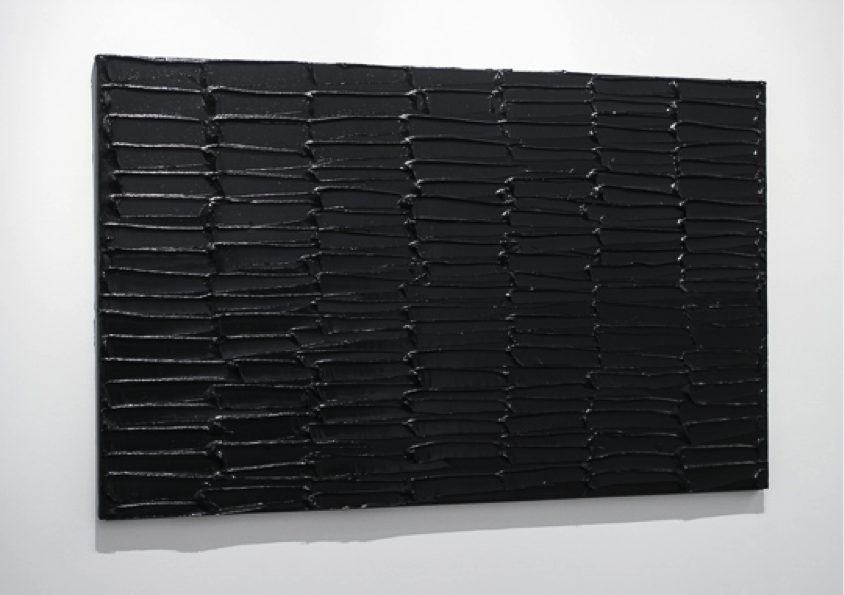 A verőfényes napsütésből érkező látogató a kiállítás első termében, egy feketére mázolt black cube-ban először nem lát semmit. Miután szeme hozzászokott a benti világításhoz, konstatálja, hogy három azonos formátumú, látszólag ugyanolyan fekete monokróm festménnyel áll szemben. (Peinture 130 x 130 cm, 3 mars 2012; Peinture 130 x 130 cm, 5 mars 2012; Peinture 130 x 130 cm, 6 mars 2012). Közelebb érve a képekhez, a látogató rájön, hogy tévedett, ugyanis a képek folyton változnak annak függvényében, hogy milyen távolságból, milyen szögből, és milyen fényviszonyok között nézzük. A képekből sugárzó fény sajátos teret alakít ki. Ez a tér a középpontos perspektívával dolgozó festményekkel ellentétben nem a vászon mögött, hanem a vászon előtt testesül meg.[3] A két részre tagolt művek matt és fényes, illetve sima és barázdált felületek dinamikus variációi. Míg egy hagyományos kiállítás esetében a kép becsillanása akadályozhatja a zavartalan befogadást, jelen esetben éppen ez az adottság kelti életre a festményeket. A sík felületen megpihen a fény, az érdesen elevenné válik. A textúrák sokfélesége révén érzékelhetővé válnak a fekete különböző árnyalatai, a fakó szürkétől kezdve az intenzív, ragyogó feketéig. Az első ránézésre monokróm művekről kiderül, hogy virtuálisan polikrómok.