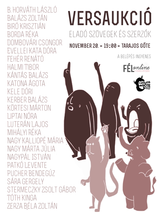 A versaukción a FÉLonline.hu versrovatának szerzői és szövegeik kerülnek kikiáltásra. A két blokkra osztott esten elsőként az alkalomra kiállított exkluzív nyomtatványokra licitálhatnak a látogatók, szerzőként három versre, a második blokkban pedig az egyes szerzők által megírandó, névre szóló költeményekre.