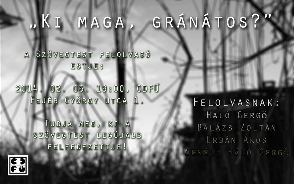 „Ki maga, gránátos?” – a Szövegtest felolvasóestje a CDFŰ-ben (programajánló) apokrifonline2014. február 4.2014. február 3.Ajánló, Programok Bejegyzés navigáció ElőzőKövetkező (facebook) Megosztás: Facebookon való megosztáshoz kattintás ide.(Új ablakban nyílik meg) Facebook Click to share on X(Új ablakban nyílik meg) X Tetszik Betöltés... Kapcsolódó bejegyzések