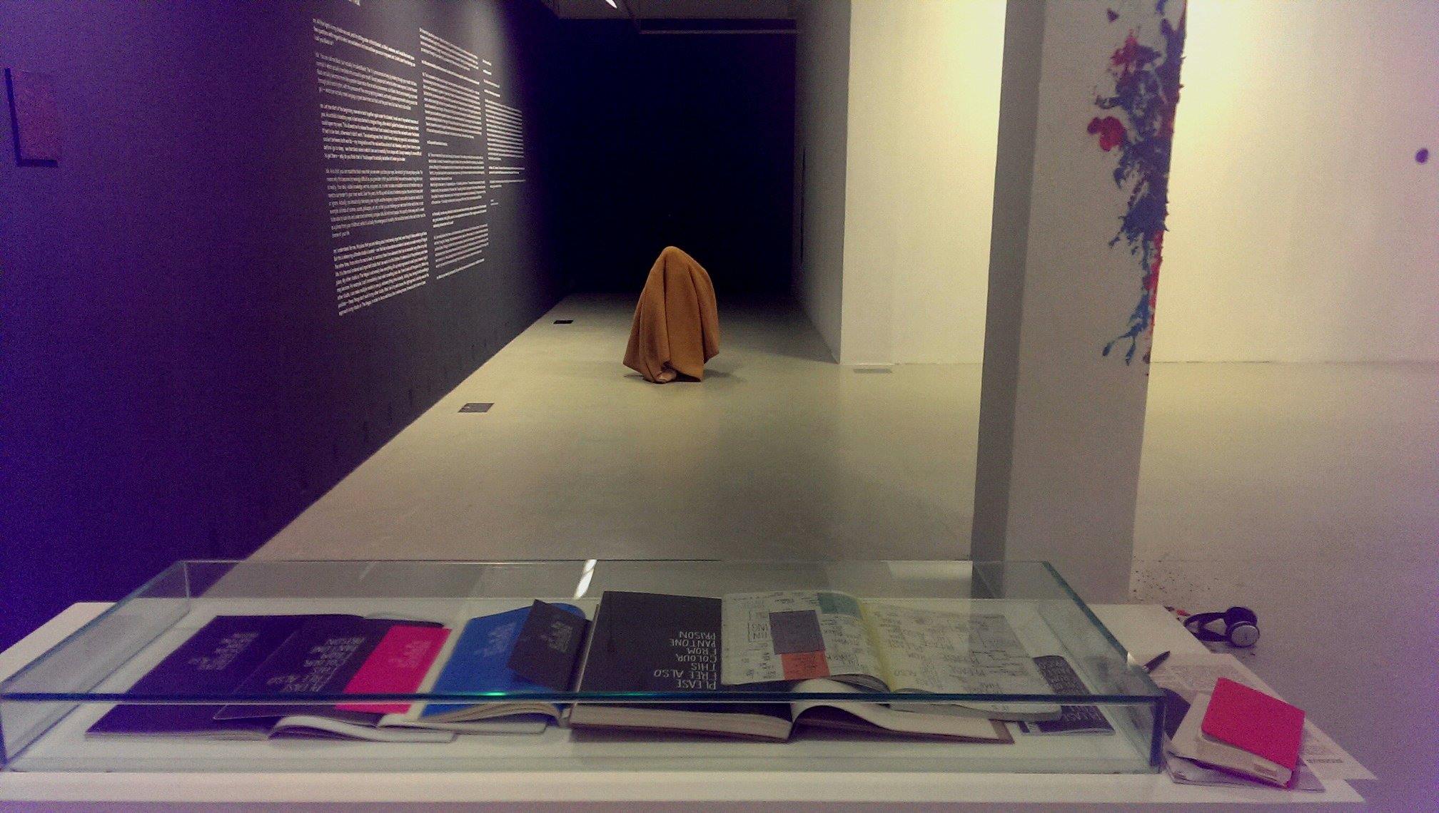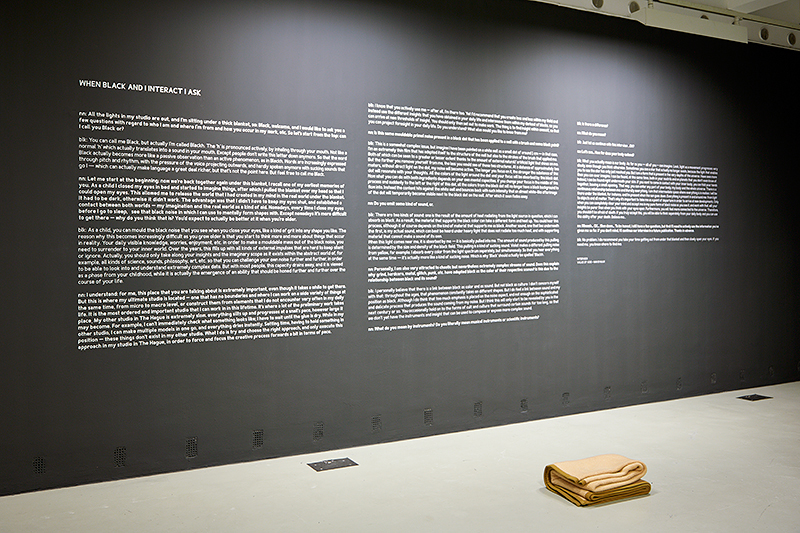 A fekete, teleírt fal előtt a padlón ott hever a vastag, gyerekkorunkból jól ismert barna pokróc – vajon megint dokumentációs célt szolgál vagy felhívás keringőre? Bárki bebújhat alá, hogy alaposan, a Nuur által adott támpontokból kiindulva megismerje a feketét, és esetleg további kérdéseket tegyen fel róla, neki. Nem tudok szabadulni a párhuzamtól, ami a gyerekkori pokrócos emlék és Kosztolányi verse között kínálkozik: „akarsz-e együtt a sötétbe menni, / gyerekszívvel fontosnak látszani”. Az igazi játék ugyanis a pokróccal kezdődik, itt végre aktívvá válhat az eddig passzívan befogadó néző, maga indulhat felfedezőútra a színek világába.