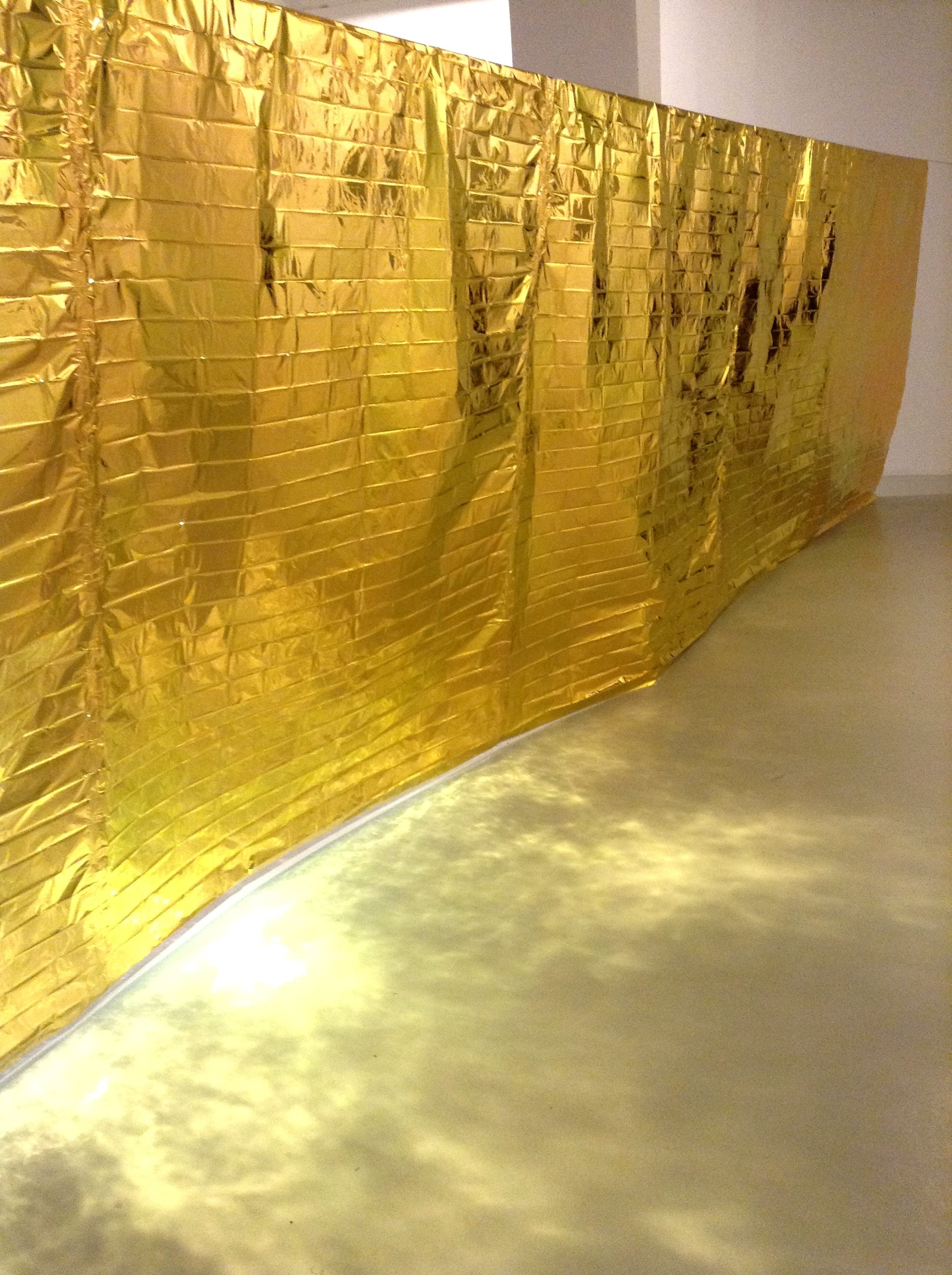 Ha belépünk a galéria terébe, jobbról a füstölt festmények mellett megnézhetjük a füstölésről készült videót, balra zizeg az aranyló izofólia – talán hasonló, mint amivel Nuur beborította a füstöléskor a műterem falát. Rögtön az elején bepillantást nyerünk tehát az alkotói folyamatba. Nuur az egész műtermet beborította fóliával, majd megtöltötte füsttel, hogy manipulálja, megváltoztassa a színeket. A füst révén a képeken olyan további felület, szokatlan hatás keletkezett, amit nem lehetett volna létrehozni festékkel vagy más eszközökkel. Ahhoz viszont, hogy a képeket nézve megérthessük egyediségük okát, elengedhetetlen a videó, hiszen a füst mozgását látva „mozdulnak meg” a színek a táblákon is. Balra az aranylón mozgó, tükröző, zizegő fólia-fal szintén tökéletesen szemlélteti Nuur törekvését a színek kiterjesztésére. A megvilágított fólia visszaveri a fényt, megfesti a teret, tükrözi a festményeket és a látogató alakját, ráadásul aláfestő hangot is ad – ezáltal mutatja az utat, de egyben el is rejti a kiállítás nagyobb részét.