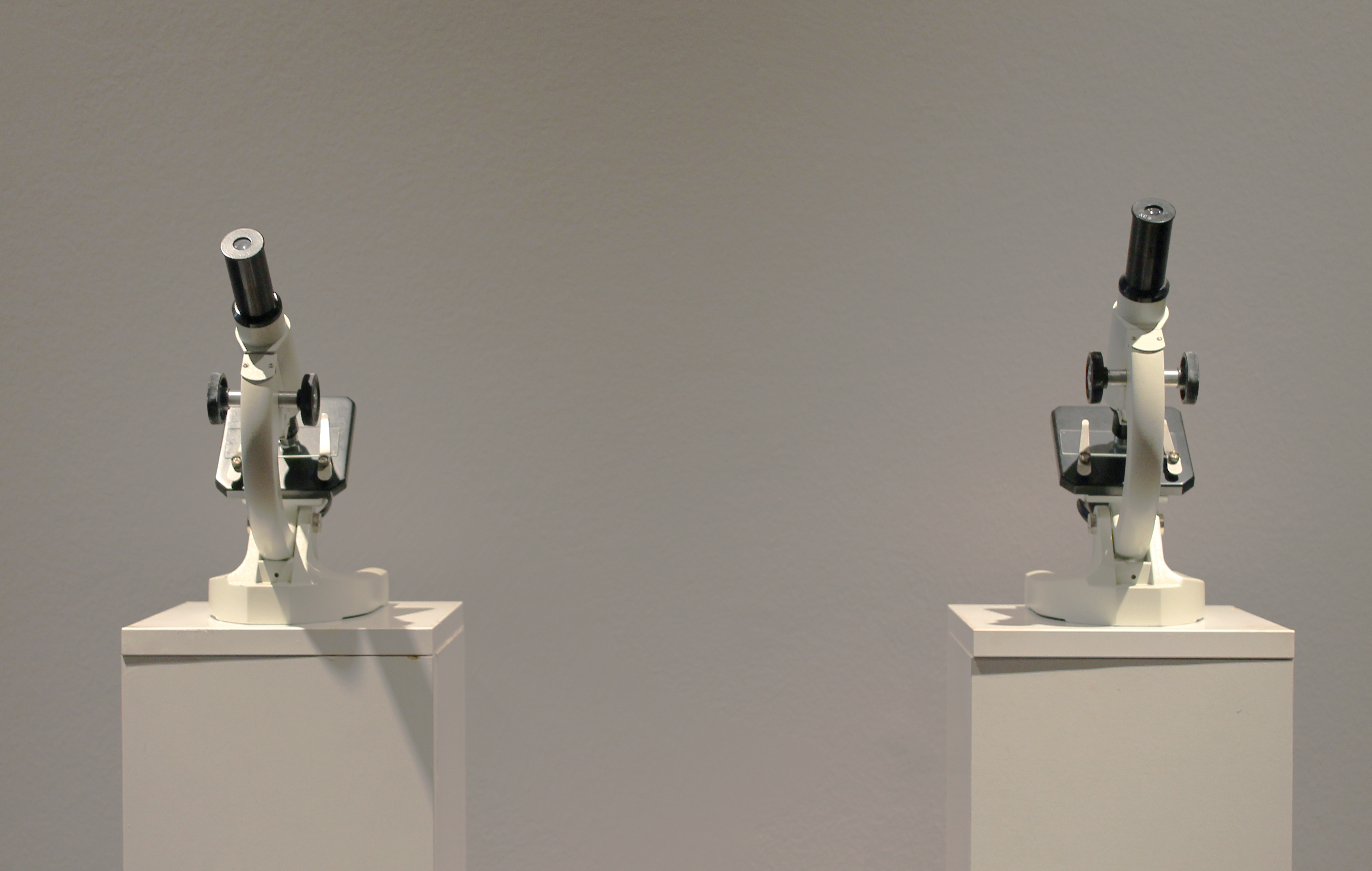 Nem a minőség, mindinkább a munka kiválasztása miatt érzem azt, hogy Albert Ádám is azok csoportjába tartozik, akiknek benne „kellett” lenniük a kiállítók névsorában. A már jól ismert 17. századi holland Hoogstraten-féle „perspektíva-kabinet” ihlette munkák egyike most éppen Debrecenben, Goethe szellemi intim szférájába enged bepillantást (Never Take a Trip Alone – J. W. Goethe dolgozószobája, 2011). „Éhes szemnek ez az eledele.”[2] Egy animáció és egy rézkarc egészíti ki a voyeur-installációt, amely így minden oldalról körüljárja a témát hűvös, objektív szemmel – s majd „a publikum ízekre szedi nyomban.”[3] Egy másik letisztult és távolságtartó munka Asztalos Zsolt installációs párja, amely nagyon is közel hozza a rajzot, mégpedig egy-egy mikroszkópon keresztül. A Két portré (2006) és a Bárány glóriával (2006) az ábrázolásban nem rejt titkot, csak a tálalás módja az, ami meglepetést okoz, szintén mosolyt csalva az arcunkra. A mikroszkópok látványának merevségét a rajzok – méretükből adódó – pontatlan lazasága ellensúlyozza és teszi intimebbé.