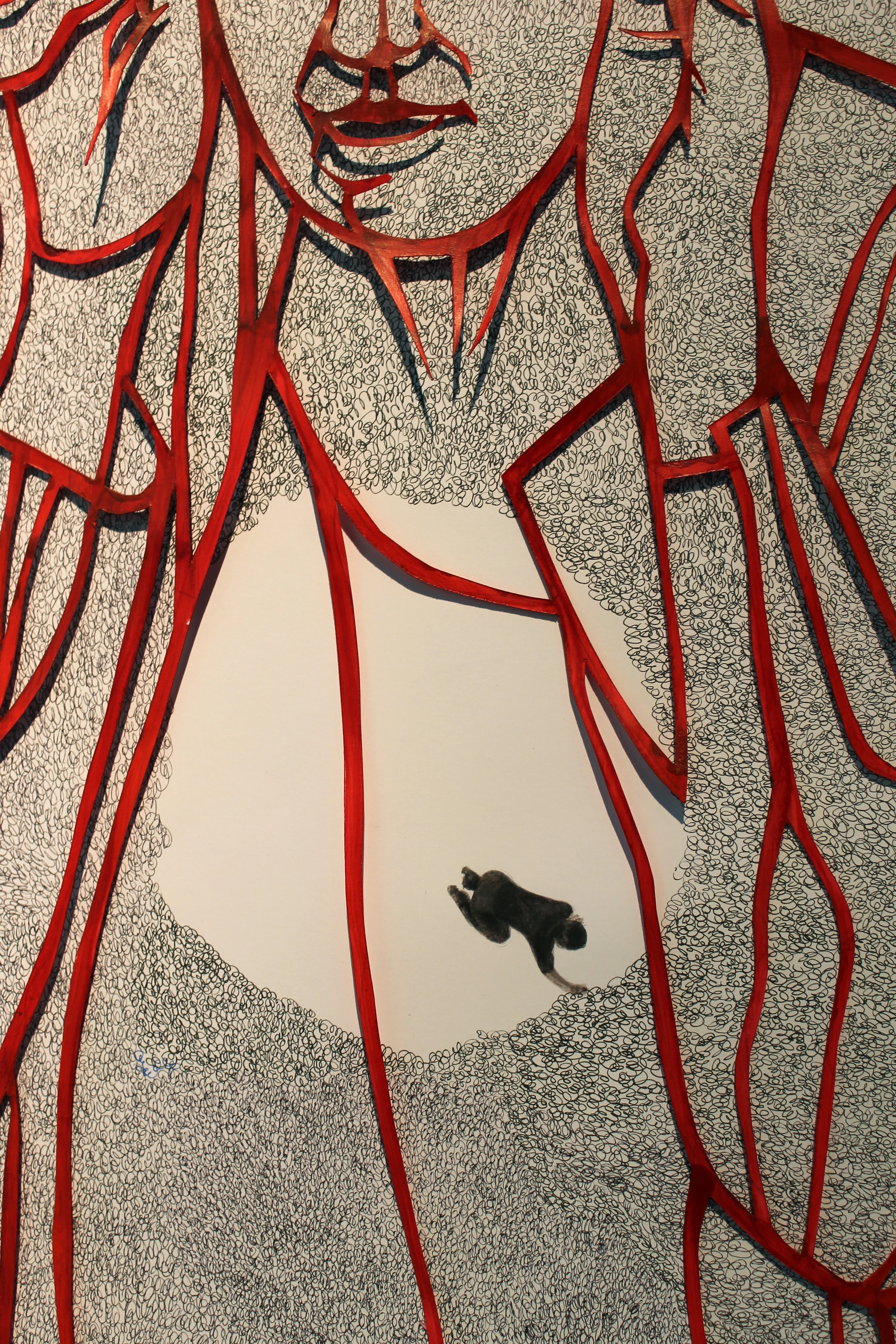 Chilf Mária piros, áttört, önmagába leselkedő papír figurája szíve táján kicsiny folt fehérlik, amely – még – nincs körberajzolva. Vajon védelem ez, mint a körbeseprés, csak itt kusza vonal a biztosító háló? Vagy balsejtelem, és az önmagába harapó rajzolót láthatjuk?