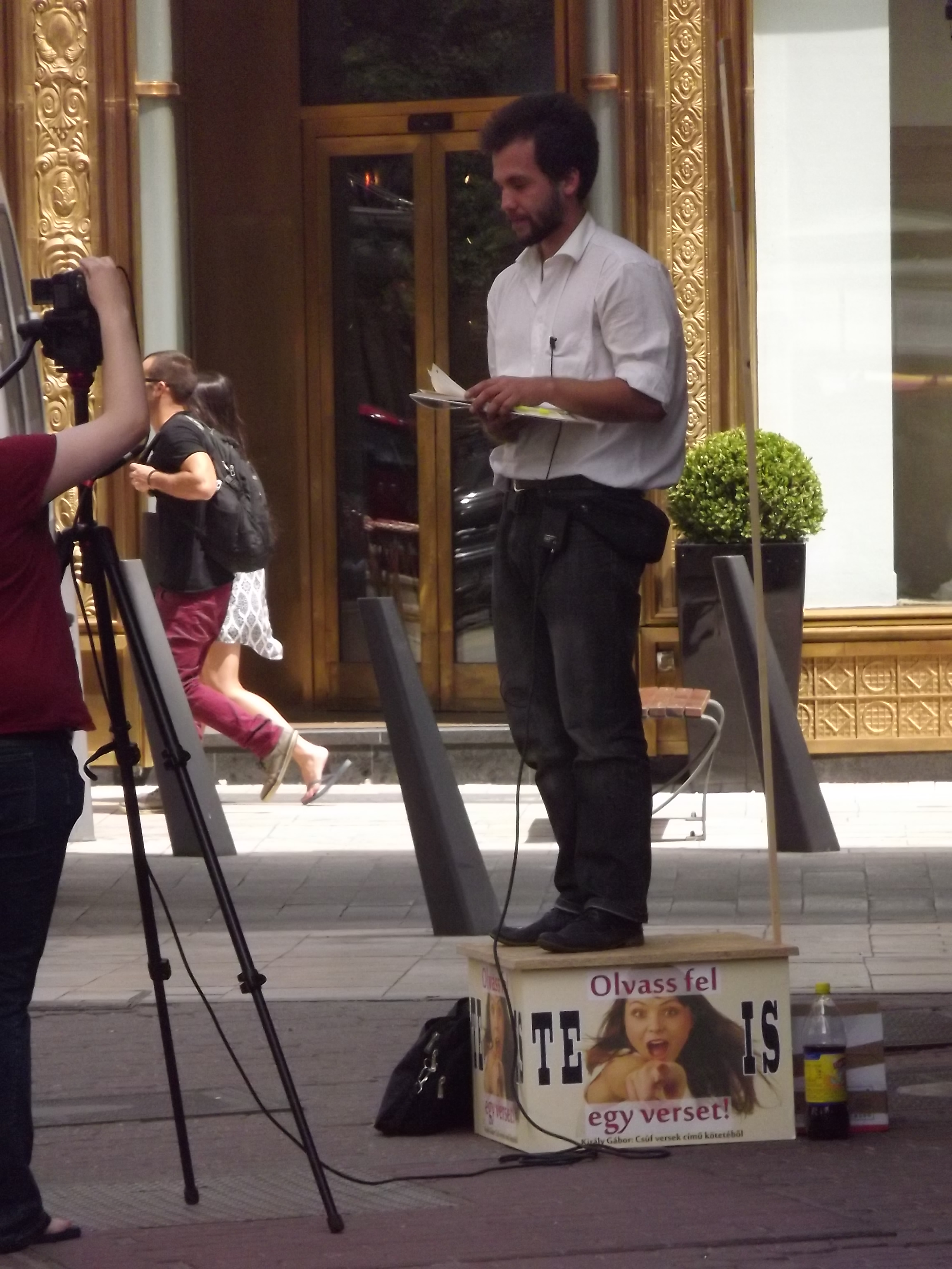 Könyvhét, második nap. Eddig turistaként, most letelepedni vágyva. Sok minden változott az utóbbi évben. Korábban csak ímmel-ámmal olvasó, kortárs irodalom iránt szkeptikus. Mostanra verset írogat, meg is jelenget néhol, sokat olvas, és a barátai között fiatal költők, írók. Többen elsőkötetesek. Majdnem kötelesség kilátogatni. Persze szívesen. Meleg, de szeles idő. Néha egész elviselhető hőmérséklet, kisebb enyhülés a tegnapi és tegnapelőtti – mikortól is tartó? – hőguta után.