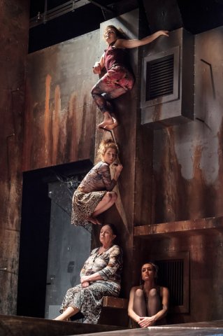 A tér lehetne lerombolt gyártelep vagy egy városszéli, lepusztult környék. A falakból kiálló szegek mintha magukra a szereplőkre merednének. Oresztész (Rétfalvi Tamás) és Élektra (Martinovics Dorina) mintha egy kivégzés előtti börtöncellába lennének zárva. Az otthonosság érzetétől távoli hely a folyamatos fenyegetettség üzenetét hordozza.