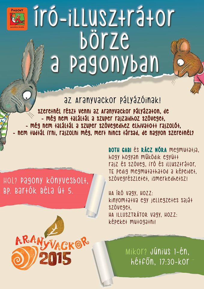 – nem tudtál írni, rajzolni még, mert nincs társad, de nagyon szeretnélAkkor gyere a Bartók Béla úti Pagonyba június elsején fél hatra, ahol Both Gabi és Rácz Nóra megmutatja, hogy hogyan működik együtt rajz és szöveg, író és illusztrátor, te pedig megmutathatod a képeidet, szövegrészletet, ismerkedhetsz!