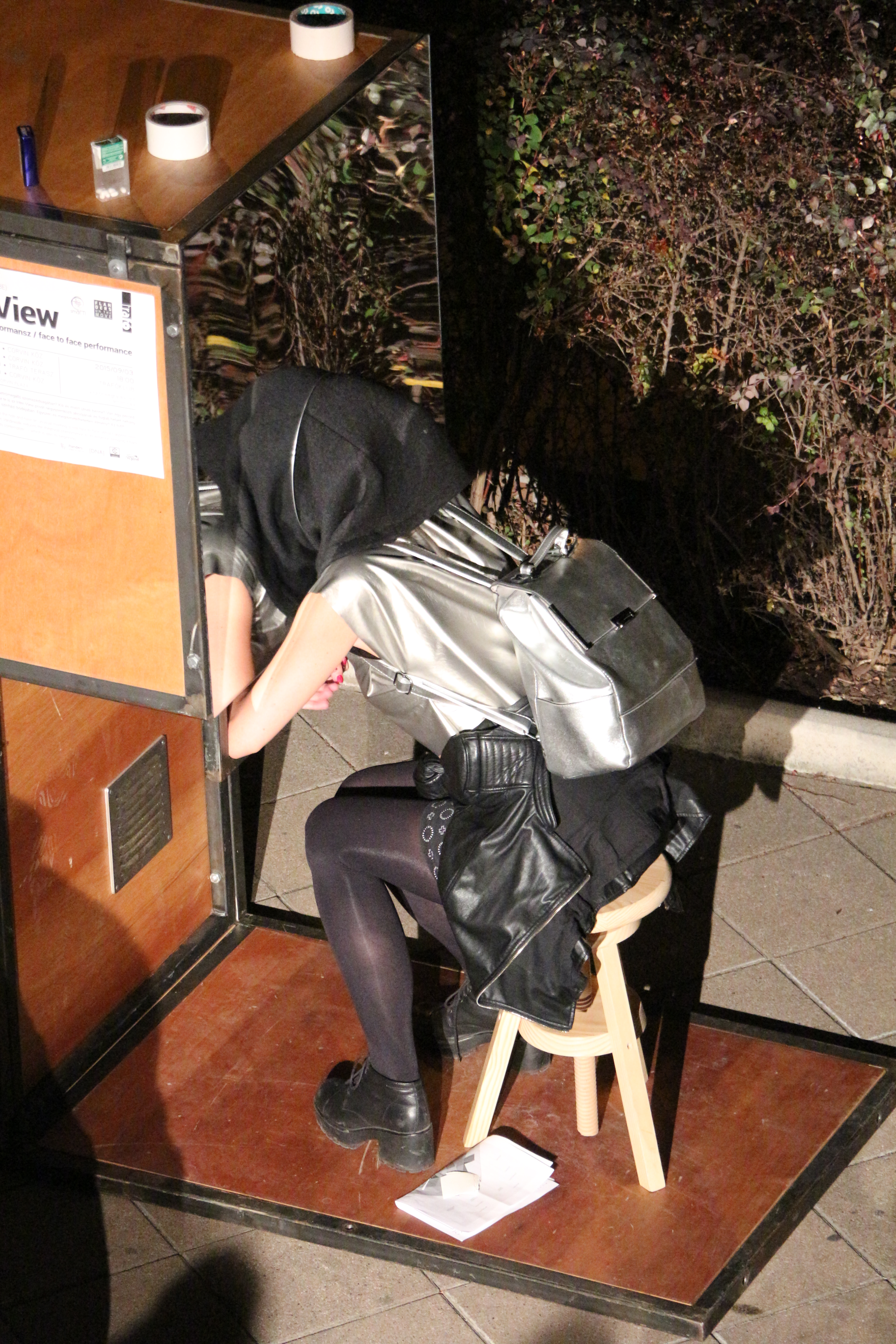 Az épületen kívül az Inter-View projekt vonzotta az embereket. A Benjamin Vandewalle építette trükkös dobozok szemben az épületen belüli akcióval nem a digitális tér horizontjából léptek elő, hanem az itt és most pillanatát ragadták meg direkt formában, egyszerű eszközökkel. Bár voltak bennük gépesített részek, azokat jól elfedték a borítások, egy lámpa világításán kívül valóban letisztult volt a szerkezetek. A titokzatosság áradt ezekből a dobozokból, hiszen nem lehetett beléjük látni. Kívülről főként a visszatükröződő környezet volt tetten érhető, belülről pedig a fehér, csupasz tér. Arra is figyelt a készítő, hogy az élményt a két egymással szembenéző befogadó teremtse meg egymás számára. Aki követte a szabályokat és rákényszerítette magát, hogy percekig egy dobozba bedugva fejét össze legyen „zárva” egy idegennel, a másik fejétől körülbelül egy arasz távolságra, annak sikerült inter-view helyzetbe kerülnie.