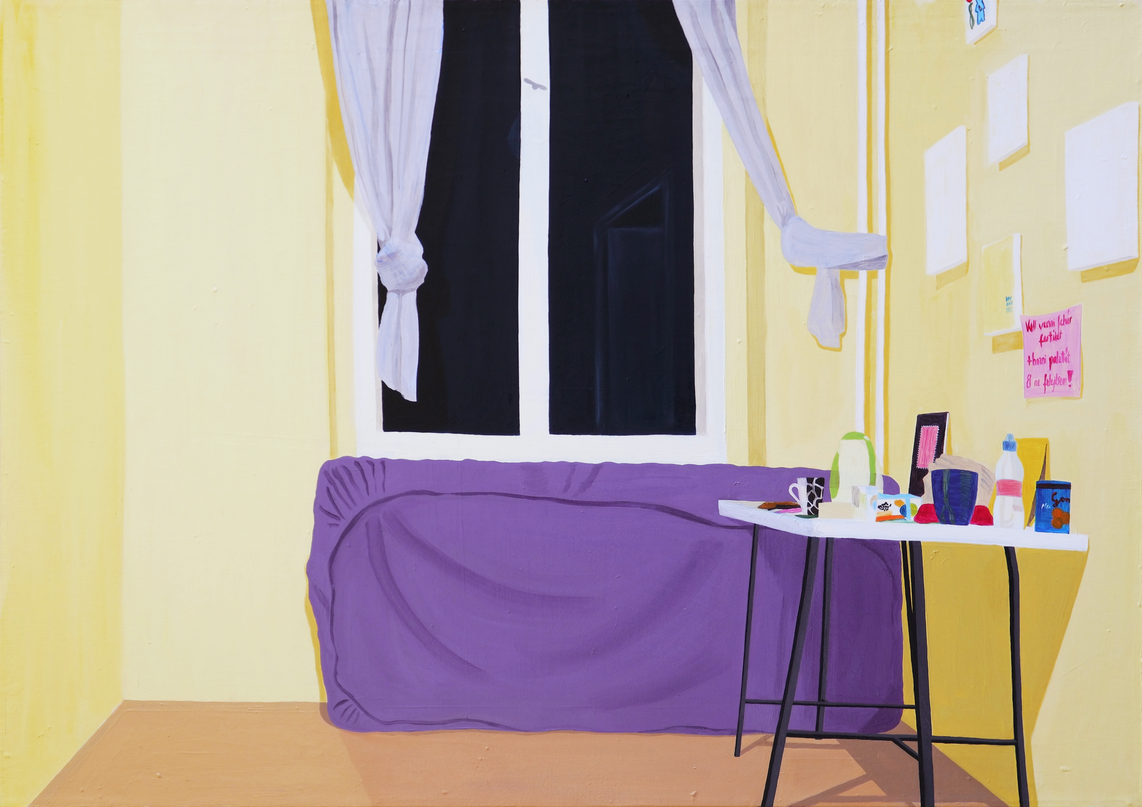 Zsófival nehéz beszélgetni, ezt többéves tapasztalattal mondom. Benntartja a gondolatait, de amit most elénk tár, az beszélő festészet: a meg nem írt regény, napi üresjáratok, tervek – mert tervezni muszáj! – a pakolászás, a szivárványos tárgyak, a napsárga falak mind-mind beszélni kezdenek hozzánk.