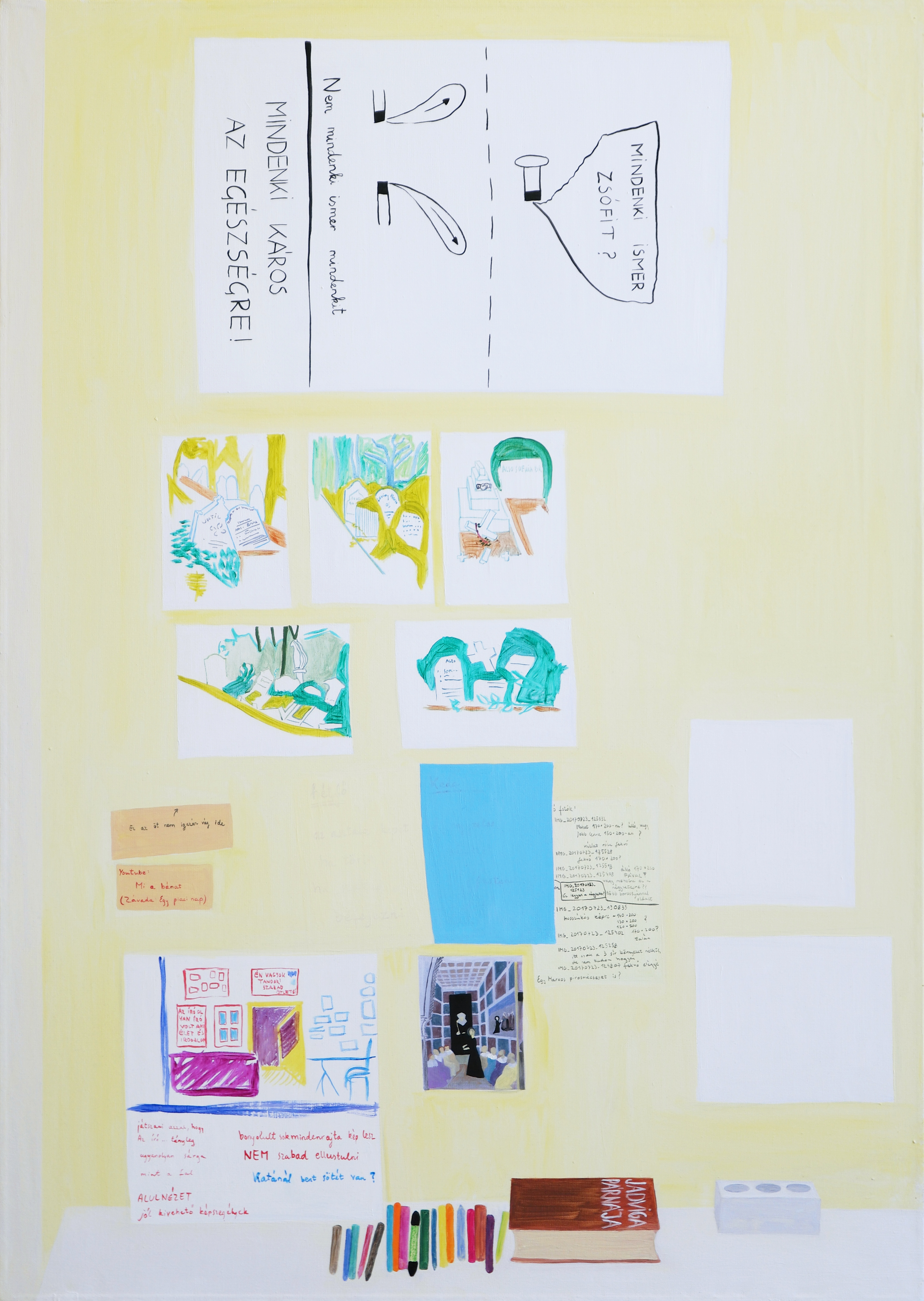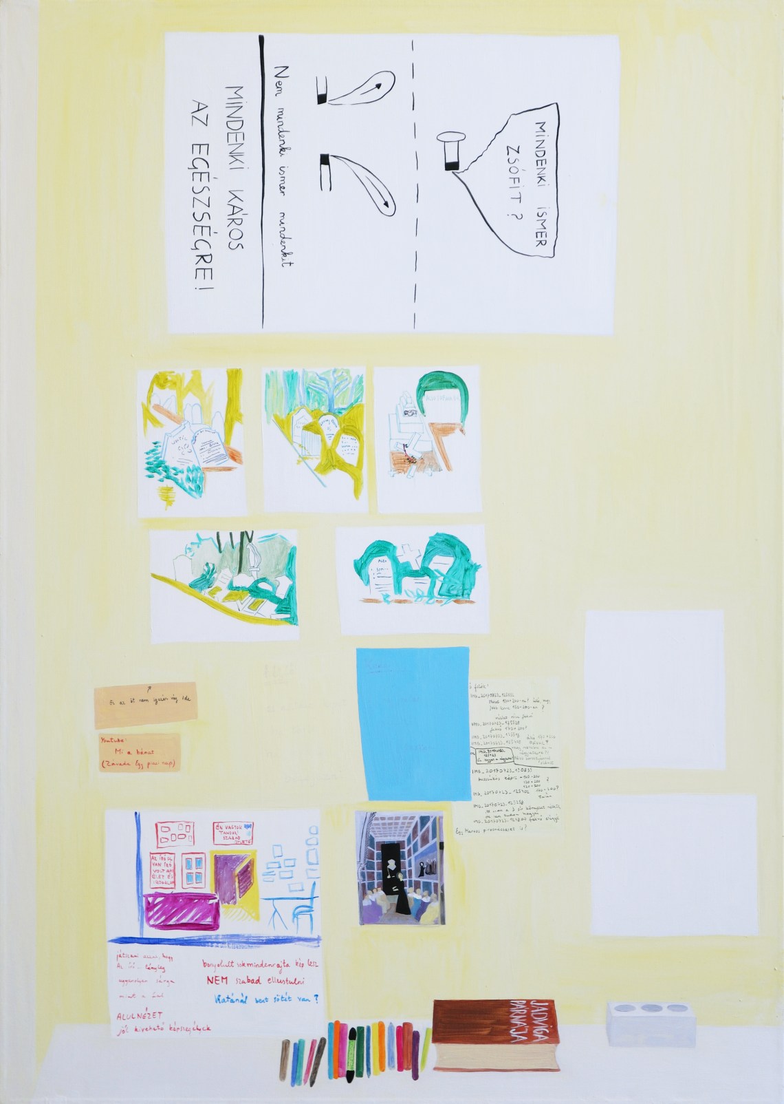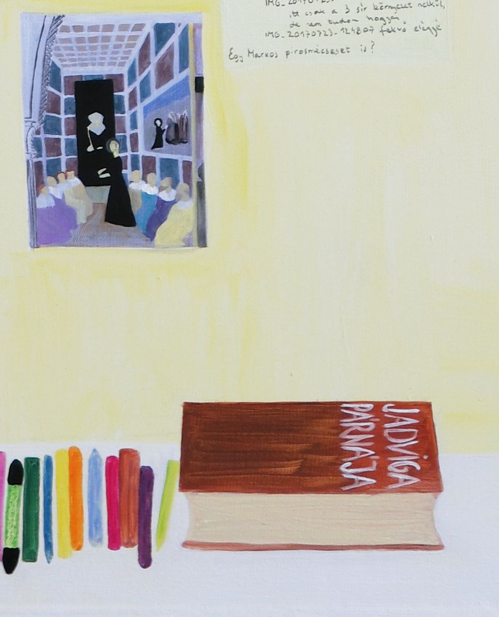 Ha körbenézünk: ahány kép, annyi rendrakás. Tűecsettel megfestett apró tárgyak, jegyzetlapok, a műterem oldalába állított matrac, fegyelmezetten sorakozó betűk: ezek hozzák létre és mutatják meg az alkotó gondolatainak terét, ugyanakkor egy valós teret is. Van-e gondolat tér nélkül? Lehet-e gondolkodni tér nélkül? Zsófinál a saját szoba nemcsak lehetőséget ad a gondolkodásra, hanem azonos is vele.