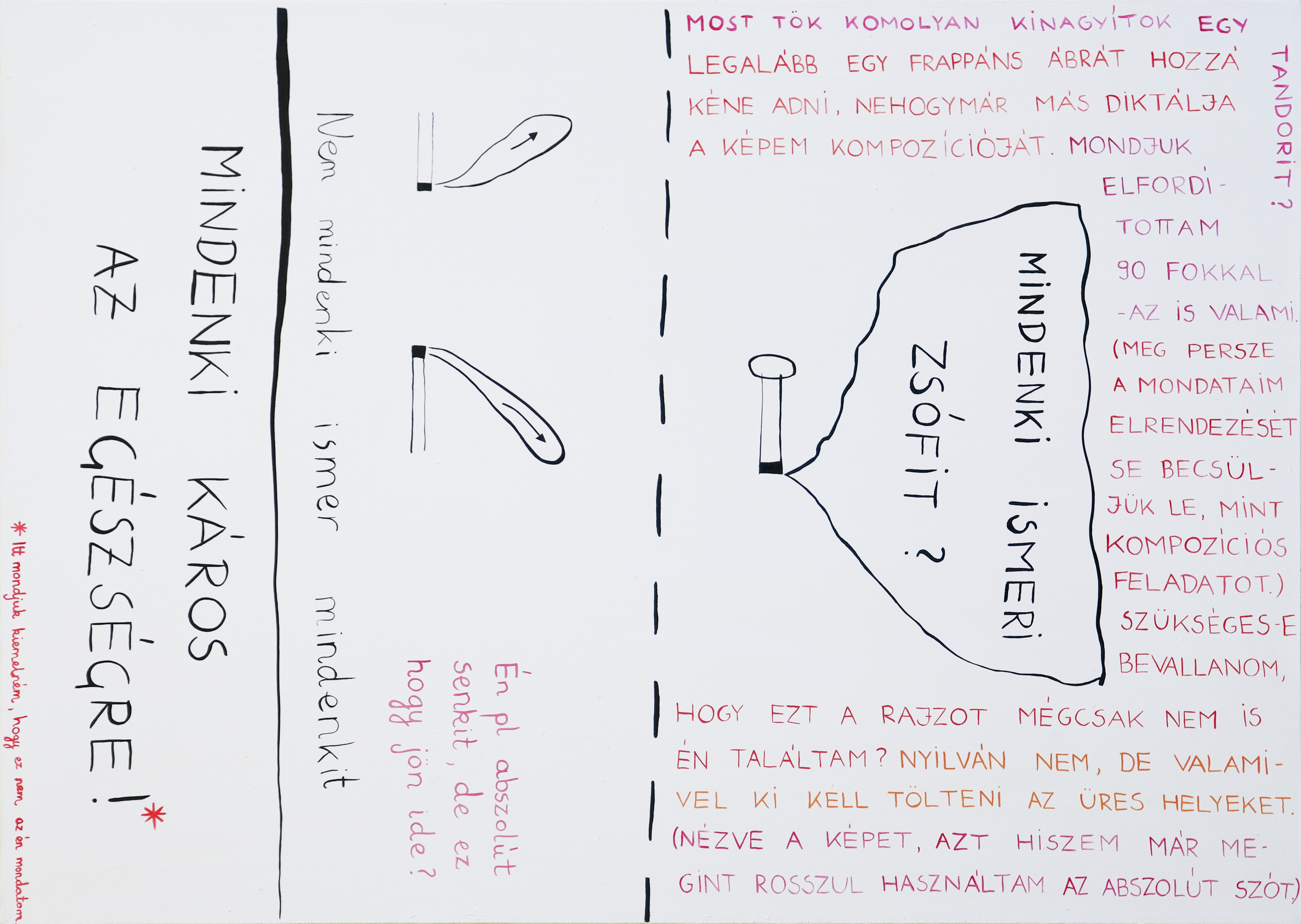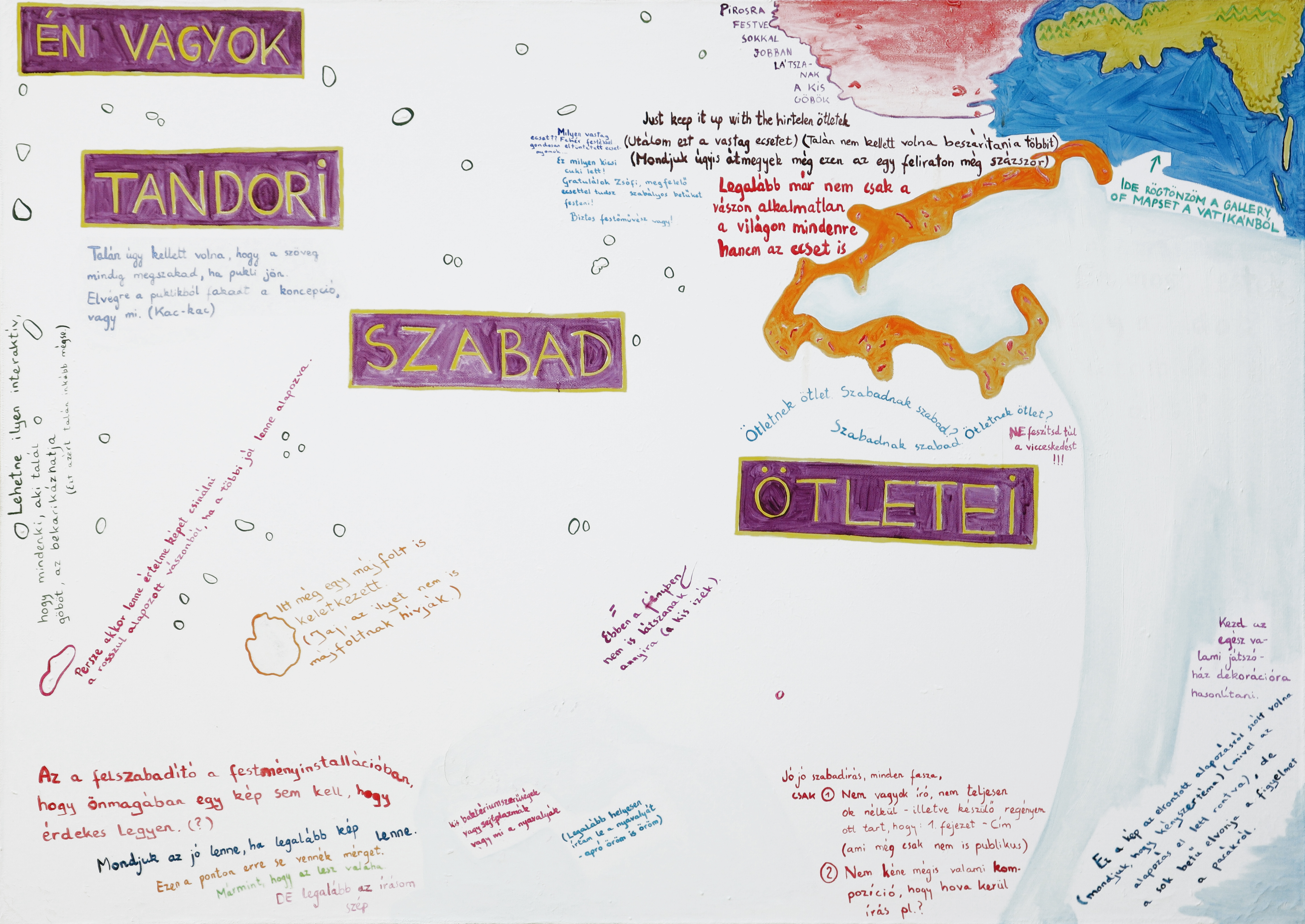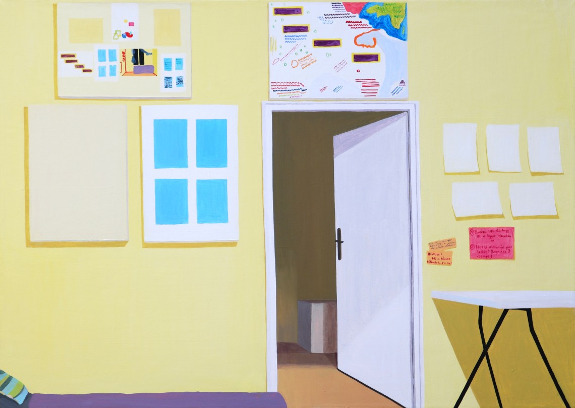 Ha körbenézünk: ahány kép, annyi rendrakás. Tűecsettel megfestett apró tárgyak, jegyzetlapok, a műterem oldalába állított matrac, fegyelmezetten sorakozó betűk: ezek hozzák létre és mutatják meg az alkotó gondolatainak terét, ugyanakkor egy valós teret is. Van-e gondolat tér nélkül? Lehet-e gondolkodni tér nélkül? Zsófinál a saját szoba nemcsak lehetőséget ad a gondolkodásra, hanem azonos is vele.