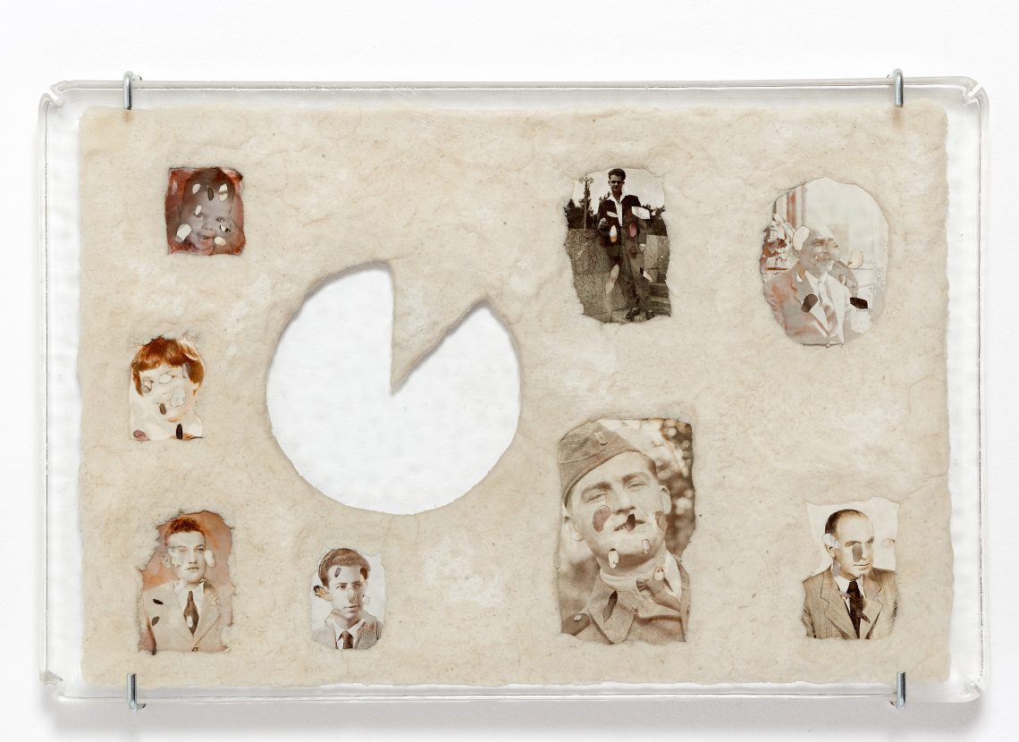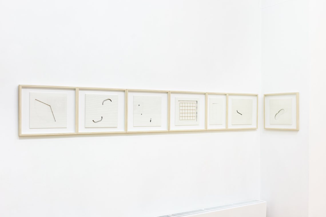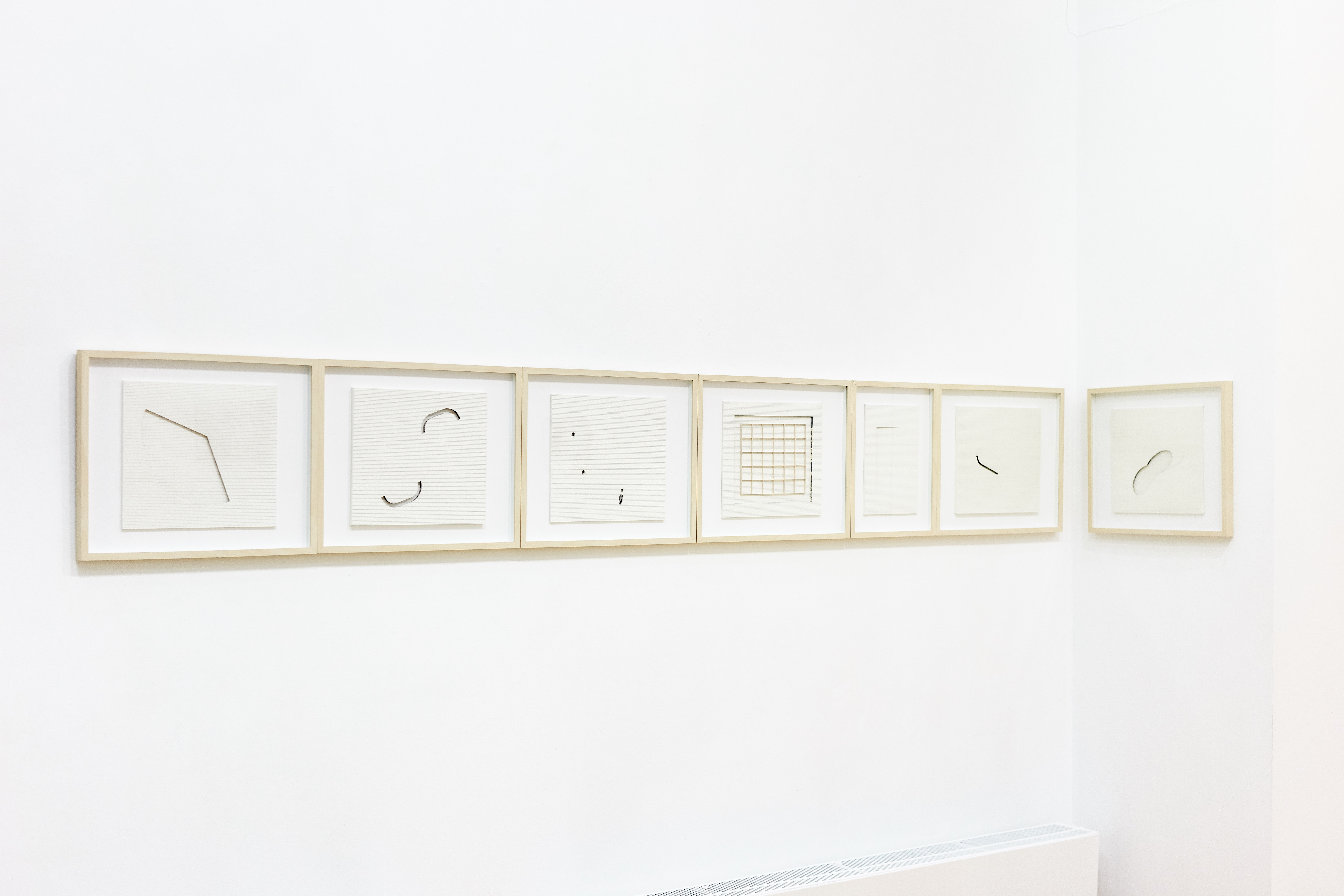 Észrevehetővé válik, hogy a falon plasztikák sorakoznak, amelyekbe különböző, hol egészen, hol kevésbé szabályos geometriai formák vájódnak. Tranker Kata e papírdomborművek legrejtettebb felületét használja ki: az előzetes elvárásokkal ellentétben a vájatok, bemélyedések falaiban nem a papír rétegződését láthatjuk, hanem fekete-fehér fotókból kivágott, tömérdek mennyiségű ismeretlen férfi, nő és gyermek arcát.