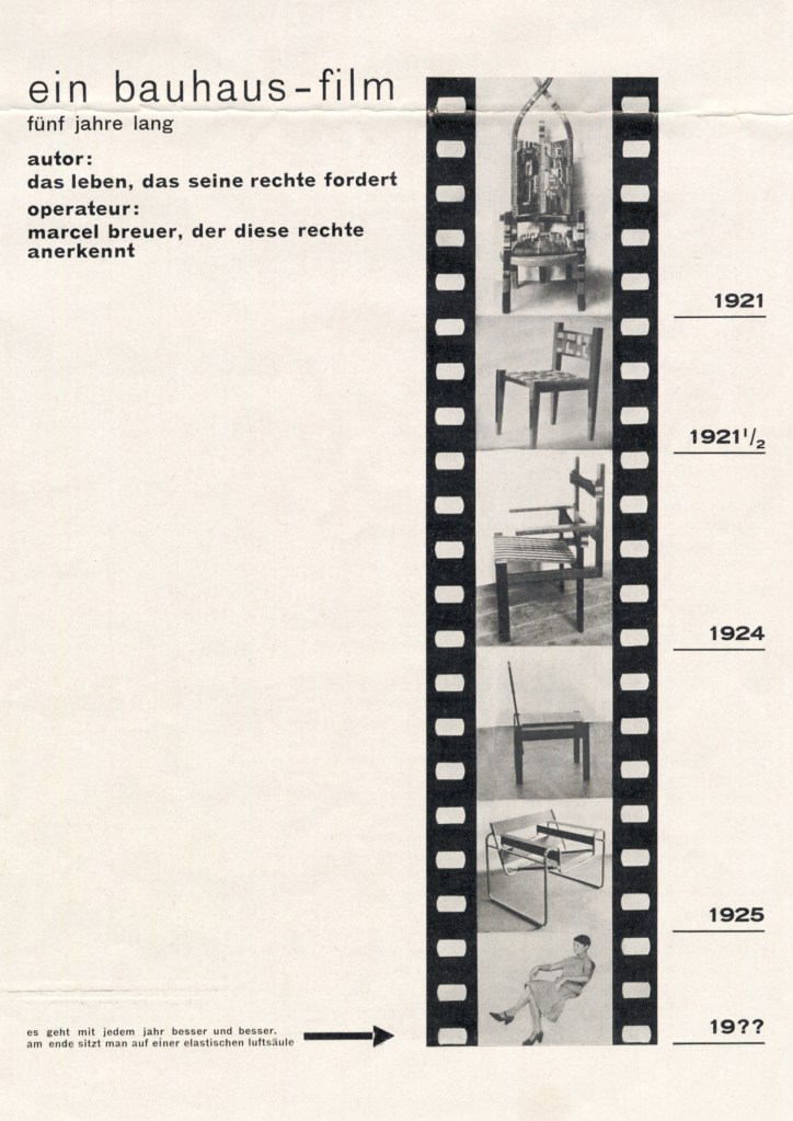 Breuer filmszalagkollázsa, az ein bauhaus-film. fünf jahre lang, 5 év Bauhaus történetet mond el radikálisan alternatív módon: székek segítségével úgy, hogy bemutatja, amint az ülőalkalmatosságból (a kézműves tárgyból) ipari prototípus lesz. Ez az aktus az irányzat lényege is: az egyedi műhelymunkától kísér el a tömegtermelésig, közben pedig egy olyan új formanyelv felhasználójává válunk, amely összhangban van a jelen kihívásaival és reflektál a kor emberének elvárásaira. A filmszalag egyik montázsában a Wassily szék látható, amely a 20. század egyik legmeghatározóbb bútor design újítása volt. Névadója maga Vaszilij Kandinszkij, akinek annyira megtetszett a szék, hogy Breuer még a sorozatgyártás előtt készített neki egyet. A filmszalag utolsó képe azzal a jövővel szembesít, amikor maga a formatervezés folyamata válhat meghaladottá. Mint a kollázshoz mellékelt szöveg prognosztizálja: „minden évben egyre jobban és jobban megy. A végén az ember egy rugalmas levegőtámaszon ül.”