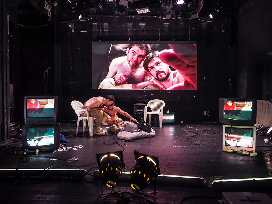 Hasonlóan üresjáratnak tekinthető az előadás egyik legerősebb jelenete, amit a Megölni egy arabot című novellából ültettek színpadra. Marost egy ezredes ismerőse elviszi magával kihallgatásra, egy lekötözött tinédzsernek tesznek fel kérdéseket, akiről gyanítják, hogy terrorista. Ficza játssza mindhárom szereplőt, önmagával vitatkozik az ezredes és Maros képében, a fiú hangján pedig egyre ismételgeti: ő ártatlan, csak az anyját ment meglátogatni. Nagy Zsolt végig szótlan, hátrakötözött kézzel ül a széken. A kamera az ágyékát veszi, tisztán látjuk a kivetítőn, ahogy végigcsorog a fehér műanyagon a vizelet. A jelenet végén a pofont is megkapjuk, nagyon megrázó élmény. A narratíva szempontjából mégis felesleges közjáték, mivel a főszereplő történetéhez alig kapcsolódik, ő megfigyelő csupán, nem róla szól a sztori. Persze szó sincs róla, hogy ki kellett volna venni az előadásból, csak arra próbálok rávilágítani: nehéz dolgozni ilyen alapanyaggal, a dramaturg rosszul jön ki a végén, akárhogy dönt.