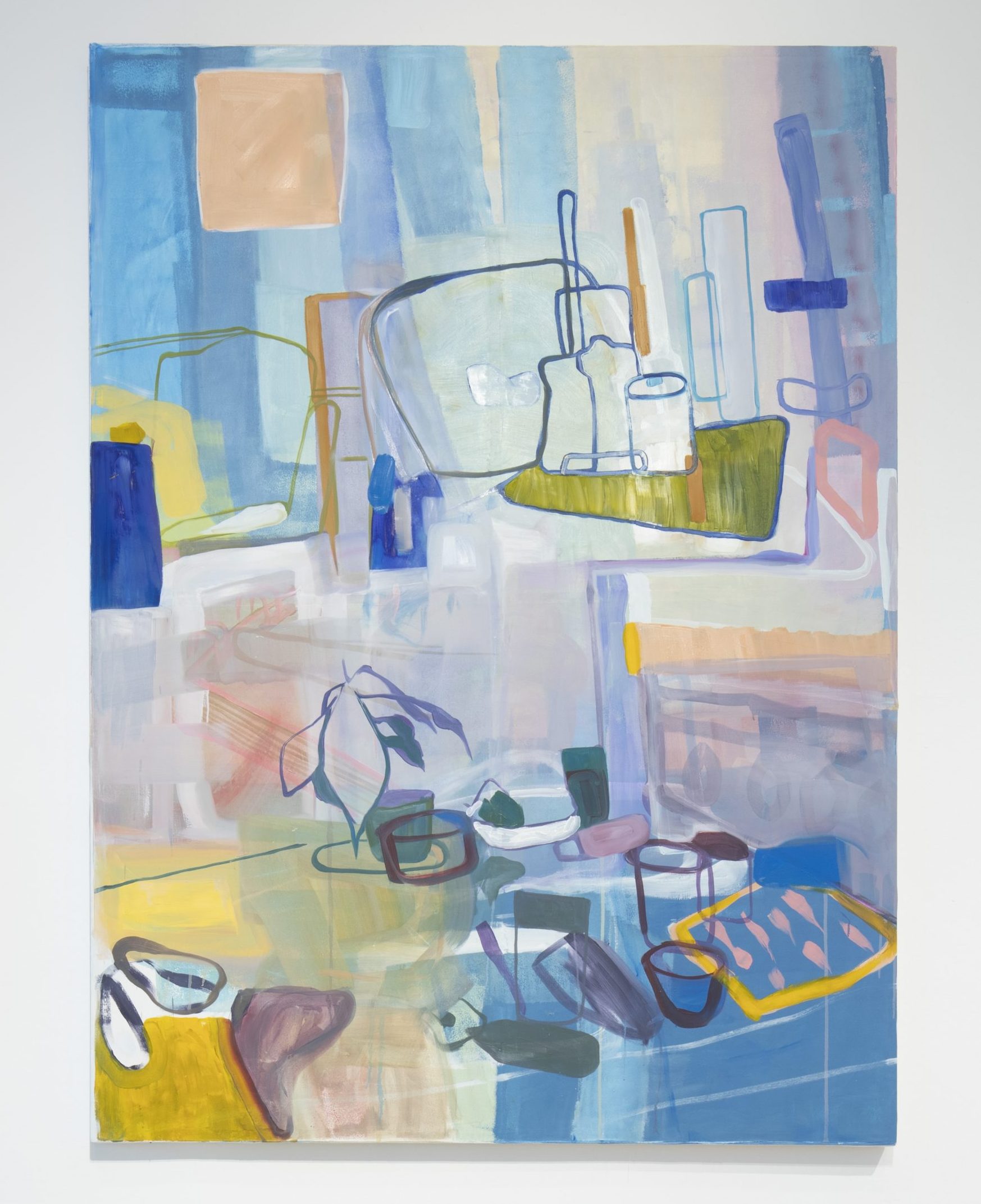 A kiállítótér első termében Kalocsai Dorottya színpompás képei fogadnak. A festőművész 2013–2018 között a bécsi Iparművészeti Egyetemen tanult festészetet és animációs filmkészítést. Művei hétköznapi tárgyakat ábrázolnak egy adott pillanatban, környezetben megfigyelve és értelmezve őket. Óvatosan kezeld/Kitelepítés című absztrakt olajfestményén asztalon és polcon sorakoznak csészék, üvegek, evőeszközök, tányérok. A kép voltaképpen egy dokumentum: egy enteriőrt mutat meg nekünk naponta használt és megszokott tárgyakkal, amelyekből harmonikus kompozíció jön létre. Alkotásának – ahogy hasonló témájú sorozatának – színhasználata, hangulata az otthon-lét állandó és változó folyamatára koncentrál.
