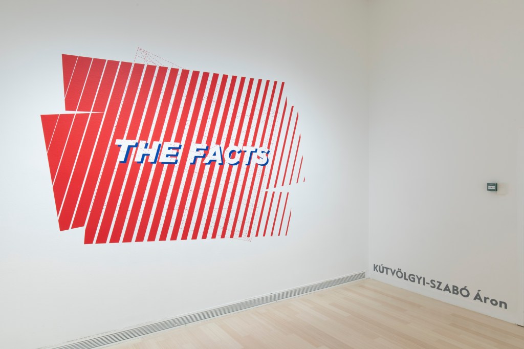 Kútvölgyi-Szabó Áron kiállított munkájából elsőként egy hatalmas matricafelületet vehetünk észre. Az egyre szélesebb fehér csíkokkal felhasított vörös mező felirata: the facts. A Counterfactual counterimages középpontjában azonban egy hosszabb szöveg áll, amely 1969-ből származik, és a British American Tobacco egy PR-ral és marketinggel foglalkozó leányvállalata, a Brown & Williamson cég készítette belső anyagként. Később, amikor kiszivárgott a dokumentum, kitört a botrány, hiszen kiderült, hogy a mamutcég egészen aljas módon tervezte „reklámozni” a cigarettáit. Tisztában voltak azzal, hogy az orvostudomány állításait nem lehet tételesen cáfolni, de arra láttak esélyt, hogy a cáfolatnak tűnő kiragadott adatok és ál-bizonyítékok terjesztésével összezavarhatják a leszokáson gondolkodókat. Így tudatosan törekedtek arra, hogy fokozatosan kételyt ébresszenek a dohányzás egészségtelenségével és az erre figyelmeztető orvosokkal, kutatókkal szemben. Kútvölgyi-Szabó Áron falképén a piros csíkok vastagsága fokozatosan csökken, míg a fehéreké fokozatosan nő, a geometrikus formaegyüttes középső mezőjét pedig úgy ferdítette el, ahogyan a reklámiparban a tényeket szokás.