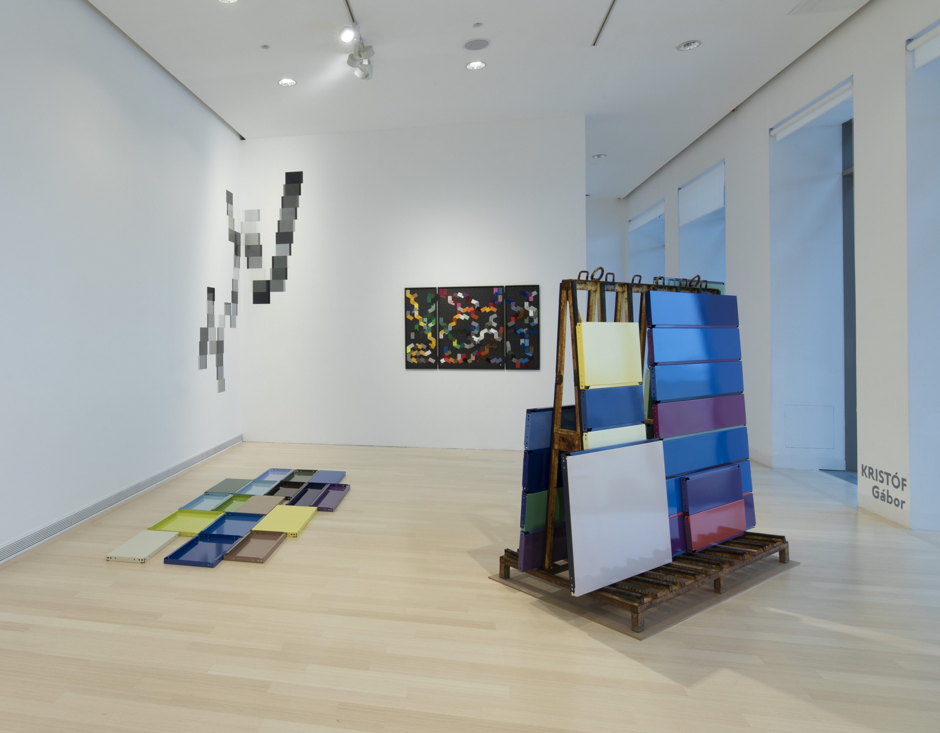 Ugyanitt állított ki a Csehszlovákiában született – ahogy telik az idő, egyre kevesebb lesz közülük az első generációban – Kristóf Gábor. Művei korszakunk vizuális szabványait, vagyis azokat a tömegtermelésben használat paramétereket vizsgálják, amelyeket műszaki cégek határoznak meg, hogy aztán más műszaki cégek kövessék azokat, és ebbe az egészbe a tárgyak használóinak nem sok beleszólása van. A szabványok közül a Ludwig Múzeumban látható két munka konkrétan a RAL-lal, a sztenderd európai festék- és színkeverési rendszerrel kapcsolatban gondolkodtatja el azt, aki veszi a fáradságot. Kristóf Gábor ezúttal is ipari polcelemeket emelt egyszerre konceptuális és absztrakt alkotásokká. A világon leggyakrabban előforduló 10 szín és ami közte van földre fektetett alumíniumlemezek együttese, amelyek színét a tömegtermelésben szabványosított, 213 tételből álló RAL-skálából választotta ki. Az Érvénytelen címzett (RAL standardnak nem megfelelő) című installáció szinterezett salgó polcelemeit viszont – a „homokszemcse a gépezetben” logikáját követve – egyedi módon színezte és állította ki az ipari termelés tömegtárgyaival szemközt. Munkái arra ösztönöznek, hogy ne fogadjuk el a készen kapott vizuális világot, nézzünk a szabvány mögé.