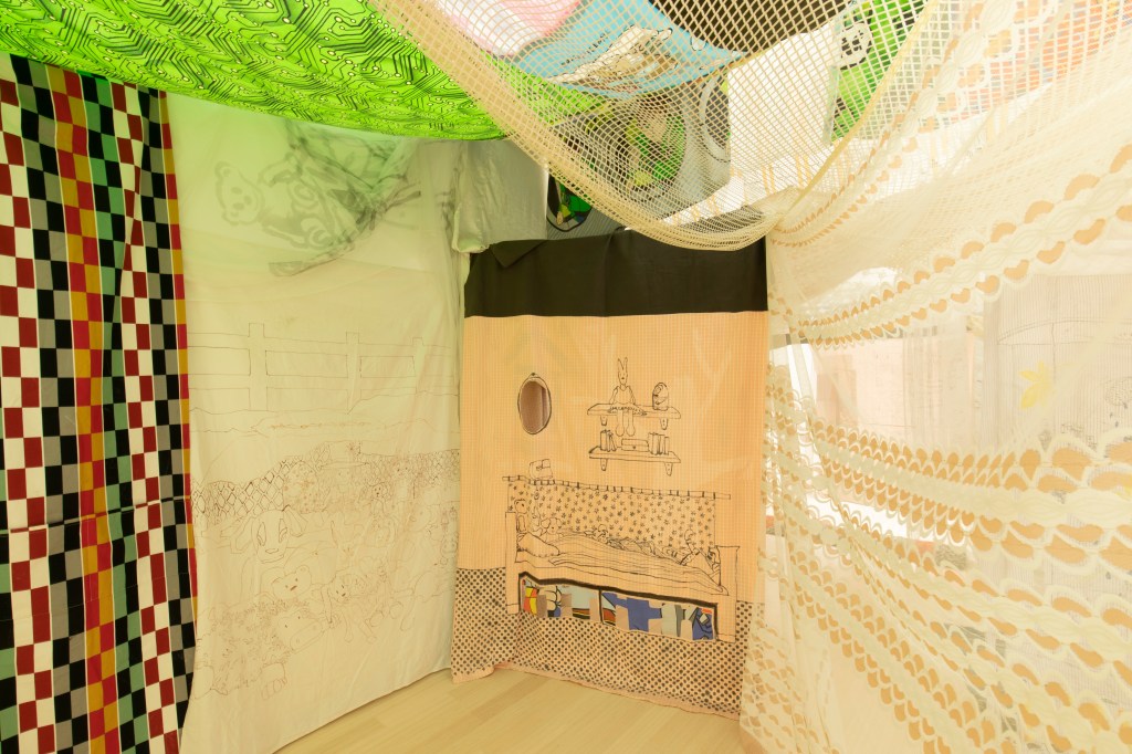 Süttő Anikó Háziasított tér című nagy méretű, bunkerszerű installációjában különböző tereket alakított ki. A játékkuckóra emlékeztető belsőben egy tizenhét perces hanganyagot hallgathatunk meg, gyermekkori és mostani otthonának hangjait. Építményét körbejárva a falakon és textíliákon vidám rajzokat, jeleket, egy hiányzó világ tárgyainak lenyomatait láthatjuk. Ebben a fiktív, meseszerű, mozgatható házbelsőben Süttő Anikó a fény, a hang és a rajzok segítségével kísérli meg az otthontalanság érzése által kiváltott szorongás feloldását. De van egy másik hasonlóan ambiciózus célja is: a bunker kiállításról kiállításra történő felállításával, azaz a gyerekkori emlékek ismétlődő felidézésével azt akarja bizonyítani, hogy bárhol lehetünk otthon.