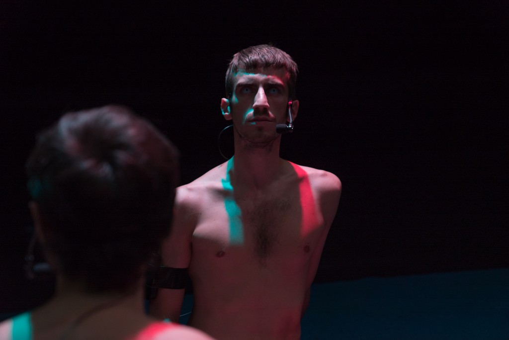 Ismerkedés. A zöld szőnyegen két meztelen férfialak. Felülről keret alakú led világítja meg őket. Az egyiknek élettelenül, cyberkékesen csillog a szeme. „Mi a legutolsó emléked?” „Szerettem forogni, a gyorsaságot, az adrenalint. A legtöbb ember szereti. Elestem. Arra emlékszem, hogy esek. A földön vagyok.” „Sírtál?” „Nem. Lehet pár percig ott feküdtem, de az nagyon hosszúnak tűnt. Egy kör közepén voltam. Néztem az arcokat, ahogy bámulnak.” – Ránk néznek. A két szereplő a talpuk párhuzamával érintkezik egymással. Amikor elszakad ez az érintkezés, a cyber megrándul. Aztán újra megtalálják a lábfejükön a kapcsolódási pontot. Egymás mögötti mozgásba kezdenek, mintha tökéletesen sima mozgású alkatrészek lendülnének együtt. Nem mechanikusan másolnak, hanem a történés pillanatában érzik meg egymás mozdulatát. Majd egy tenyér a gerinc felső részén: olyan mintha adatátadás történne. Ezáltal érzik az egyre lendületesebb mozgást, melyet az egyik ritusszerű éneke kísér. „Hatoltál már be a bőr alá?” „Igen. Félelmetes a vérre nézni, amely kiáramlik, olyan csillogó. Mintha valami kiváltság lenne részesévé válni a pillanatnak, amikor az élet elhagyja testet.”