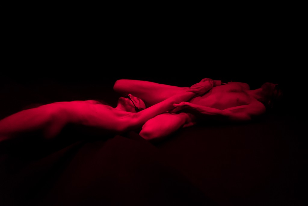 Zuhanás. Az egyik fejen áll a másik hanyatt fekszik. A fentről érkező vörös fény eltűnteti a talajt és fekete árnyékokkal szabja még élesebbre a vékony testeket. Az égbe meredő lábak lassan mozognak előre-hátra, minta ernyedt úszómozdulatokkal irányítanák a páros zuhanását. Teljesen valószínűtlen látvány egy másik dimenzióban. Ahogy a földön fekvő behúzza hasát, úgy simítja végig a bordakosarát, mintha nem is az övé volna. A másik lassan leereszkedik a függőleges irányból. Elkezdődik a harc a túlélésért és az újraszületésért. A továbbra is uralkodó sötétvörös fényben, hirtelen gyorsulva és lassulva, párhuzamosan, szaggatottan hullámoznak a gerincvonalak. Irányt váltanak, majd felkaparják a szőnyeget maguk alatt. Mintha a kicsavarodott testek olykor felénk akarnának rontani, de aztán megtorpannak és másik irányt vesznek. Hol egyik, hol másik kimászik a vörösből és beletűnik a teret körbe ölelő sötétbe. Bizonytalan, hogy hol térnek vissza. Az egyik bajba kerül, leáll a születés. A másik segít. Extatikus állapot, nagyon gyors érintések, kétségbeesés, majd teljes testével éleszti újra. Az ember nem hagyja el a cybert, amíg az be nem indul. Mintha valami erőtérben dolgozó alkatrészek adnák át egymásnak az energiát. Hirtelen a cyber feláll. Fényváltás.