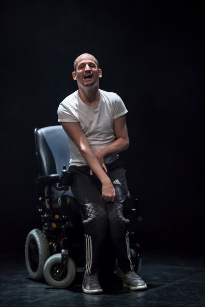 A DJ adja a ritmust, a férfi átveszi és mozogni kezd a zenére, feláll, majd fokozatosan maga mögött hagyja a kerekesszéket. A nő először csak nézi, majd reagál a testével a férfira, átveszi a mozdulatait, átformálja a saját testére, átfuttatja az izmain, magáévá teszi. Azokhoz, akik valami miatt kerekesszékben élnek, nem asszociálunk energiakitörtést, extázist, haladást – írja a koreográfus –, hanem inkább mozdulatlanságot. Jelen esetben a mozgás origója egy mozgáskorlátozott férfi. Ebben a közegben ez a jelző azonban teljesen feleslegessé válik. Ritmus van és mozgás, melyek hullámszerűen érik el a nőt. Az áttranszponált mozdulatok harmóniája felszabadítja a testeket a közhelyektől. Mivel az egymás ritmusának átvétele egy teljesen ősi, ösztönös figyelmet igényel, amikor az első érintés történik, az sokkal intimebb, mintha egy beszélgetést hallva számítanánk rá. A férfi karjával megmozdítja a nő felsőtestét, majd az átveszi az energiát, eltanulja a mozdulatot és beleadja a saját energiáját, dinamikáját. Ez a férfit újabb kezdeményezésre készteti. Ebben a figyelemben „lemeztelenednek” a résztvevők egymás előtt. Kapcsolódásuk magától értetődő, természetes, feleslegesek a szavak. Épp ezért zavarba ejtően intim, amikor egy nyugvóponton a férfi felsőtestével betakarja a fekvő nő combjait – pedig csak ennyi történik.