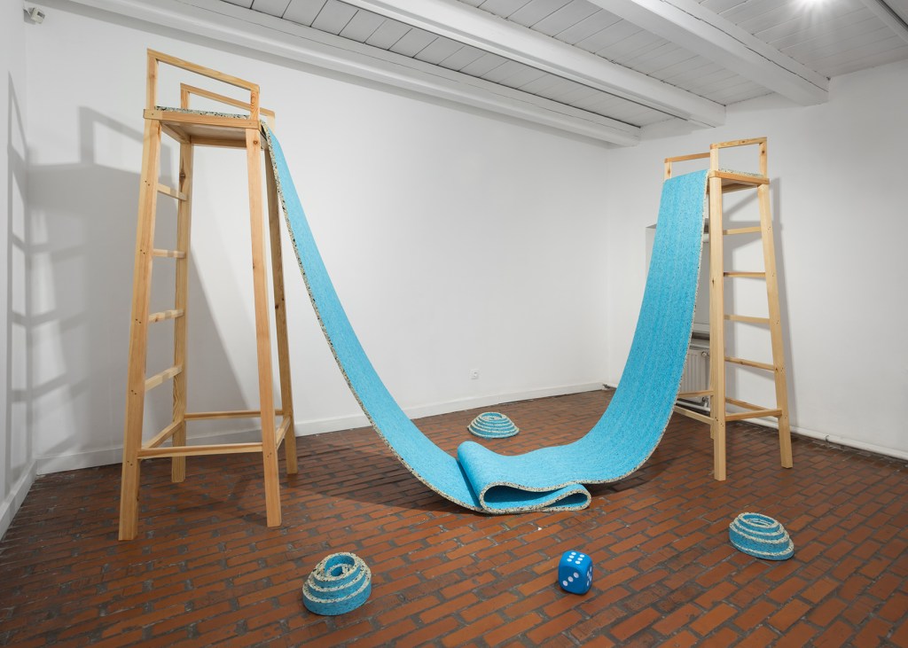 Egy munkája éppen Drezdában, a kortárs kelet-európai színtérre ablakot nyitó Ostrale biennálén is látható, mi azonban a párhuzamosan a Budapest Galériában futó, Tervezett véletlen című tárlatáról kérdeztük. A Lajos utcai kiállítóhelyen, a cellaszerűen sorakozó terekbe belépve fakockákból, rudakból, emelvényekből épített játszótérszerű világ fogad: azúrkék színű csúszda, lebegő szalagok, mászóka és libikóka. Az élére állított fakockáktól azonban megakad a mérleghinta, a csúszda a földön tovább tekereg, a libegő, színes szalagokba könnyen belegabalyodhatunk.